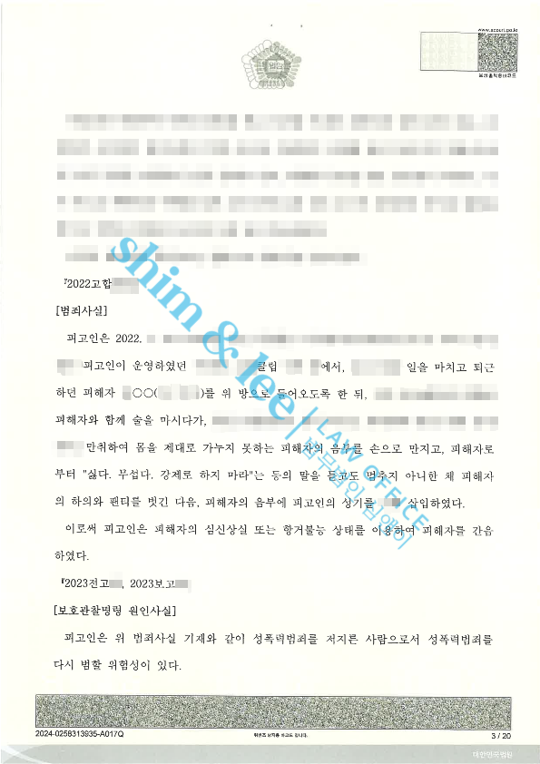 - 양주에 얼음과 물을 희석해서 3~4잔 정도 마시던 의뢰인은 갑자기 의식을 잃고 쓰러졌고, 다음 순간 정신을 차려보니 가해자가 의뢰인의 옷을 벗기고 성기를 만지고 있었습니다. 엄청난 통증에 충격을 받은 의뢰인은 ‘싫다, 무섭다, 하지마’ 라고 소리를 질렀지만, 가해자는 멈추지 않고 강제로 삽입을 해 강간에까지 이르게 되었습니다.