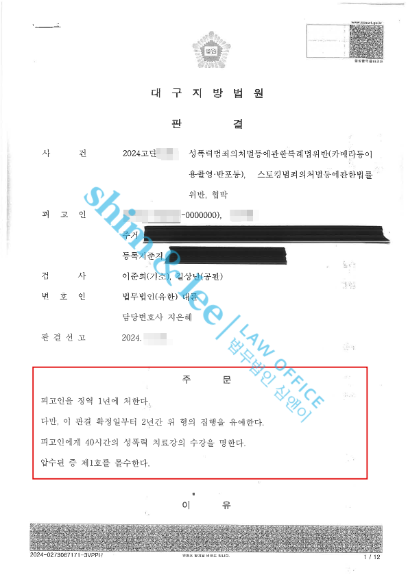 - 의뢰인님은 최초 수사단계부터 심앤이의 도움을 받아 홀로 진행하면 어려웠을 압수영장 및 잠정조치 신청부터 원하는 합의금 및 조건으로 사건을 무사히 마무리 할 수 있었습니다.