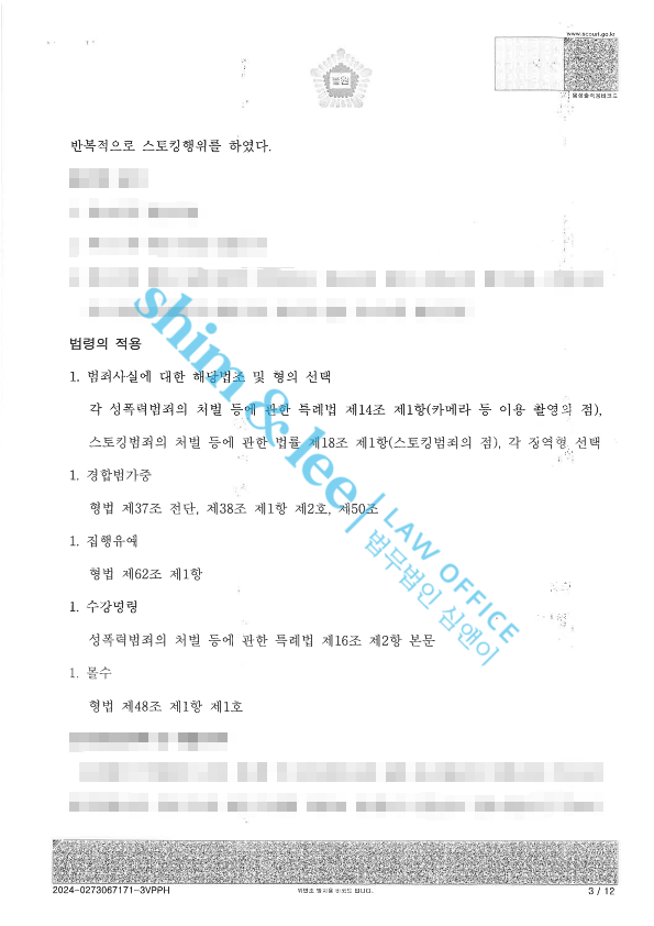 - 가해자는 지속적으로 의뢰인을 스토킹 하고 협박하는 상황으로 앞으로 다시는 스토킹을 반복하지 않도록 의뢰인의 안전을 최우선으로 생각하며 안전장치를 만드는 것에 가장 큰 신경을 썼습니다.