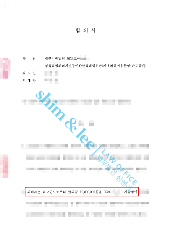 3. 심앤이의 압박으로 가해자는 모든 혐의를 인정하고 정식으로 합의를 요청해왔습니다. 대표변호사님은 상대방 변호사와 직접 합의를 위한 소통을 진행하면서 의뢰인이 만족할 만한 합의금을 조율했고, 불법 촬영물 미소지 및 유포시 손해배상 조항뿐만 아니라, 접근금지, 통신제한, 비밀유지 조항을 조건으로 합의서를 꼼꼼하게 작성하여 의뢰인이 원하시는 조건으로 합의를 진행하였습니다.