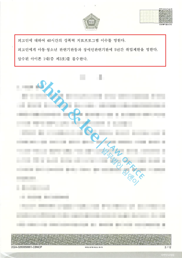 성폭력 치료강의 40시간 / 합의금 2,000만 원 -