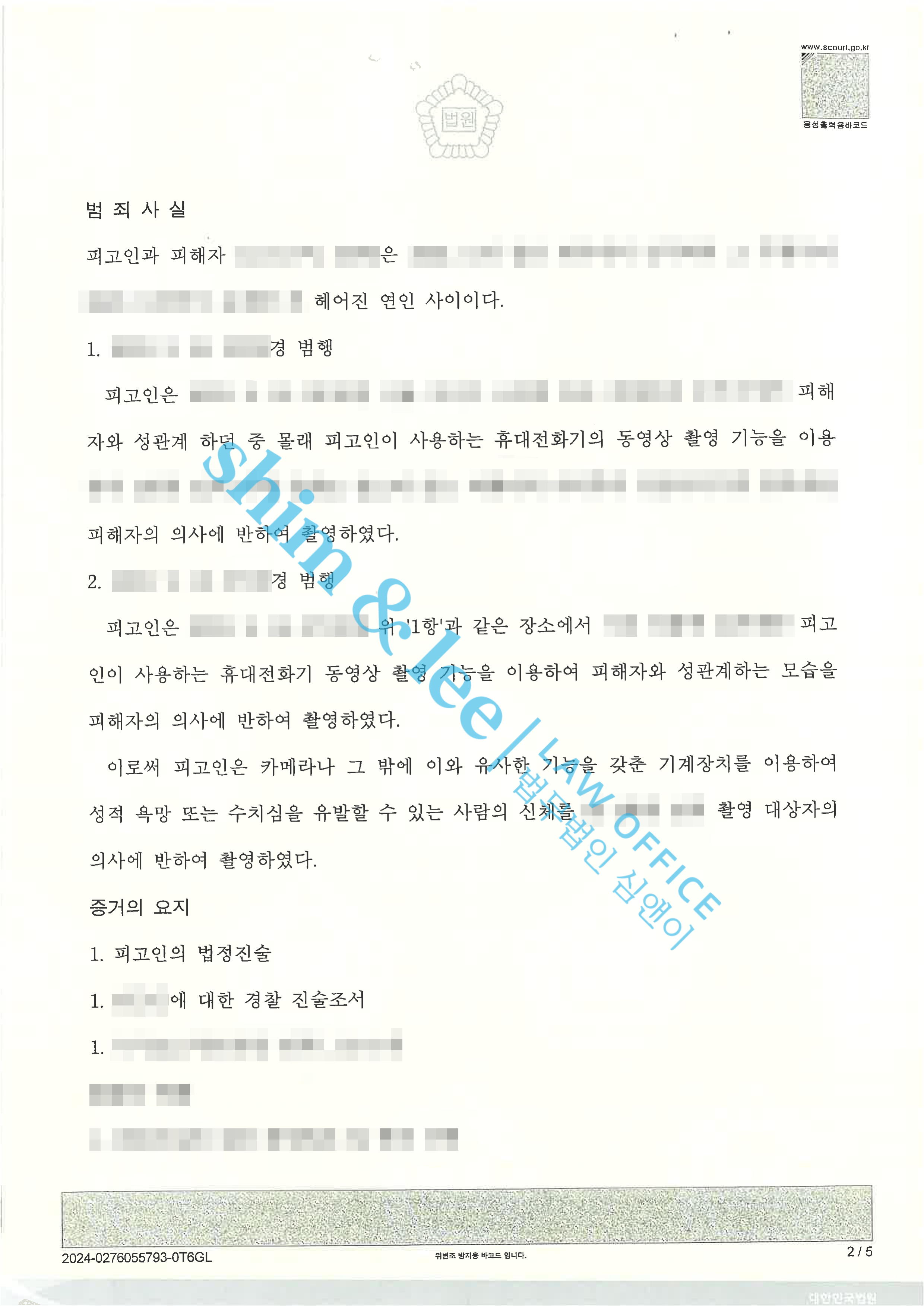 - 최근 연인 간의 불법 촬영 피해로 많은 분들이 찾아주시고 계십니다. 원하지 않는 사진과 영상을 촬영하는 것은 명백한 범죄입니다. 오늘과 같은 사례처럼 피해를 당한 분들은 두려움에 숨거나 자책하지 마시고 용기를 내어 성범죄 피해 전문 로펌인 심앤이를 찾아주시길 바랍니다.