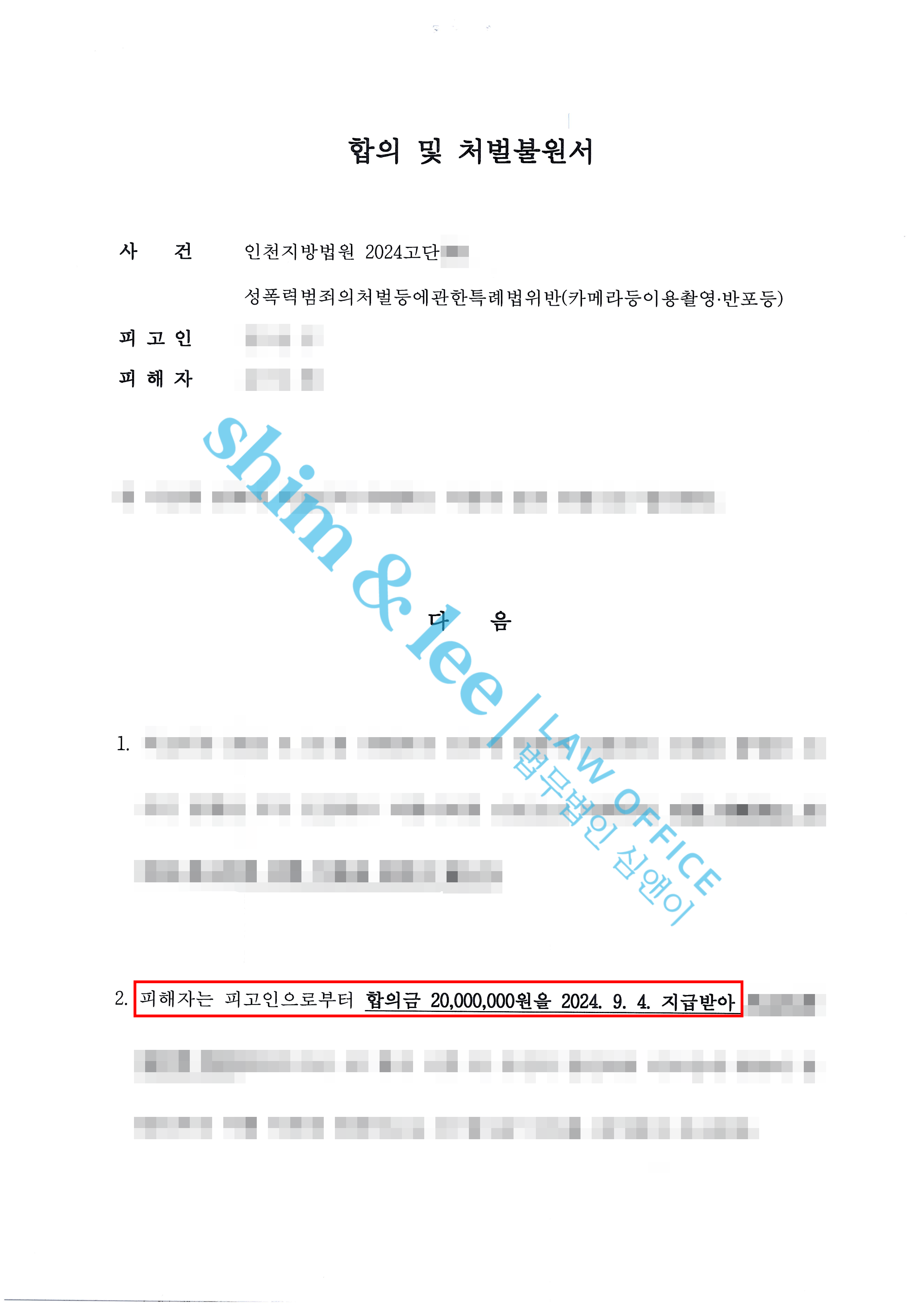- 가해자는 재판단계가 시작되자 바로 의뢰인님에게 합의를 요청했고, 이에 대표 변호사님은 촬영물 사건인 만큼 촬영물 미소지 및 유포를 하지 않겠다는 조건들을 넣었고, 접근금지와 통신제한 그리고 비밀유지 조항도 추가로 넣어 2천만 원이라는 높은 합의금으로 합의를 진행하게 됩니다.