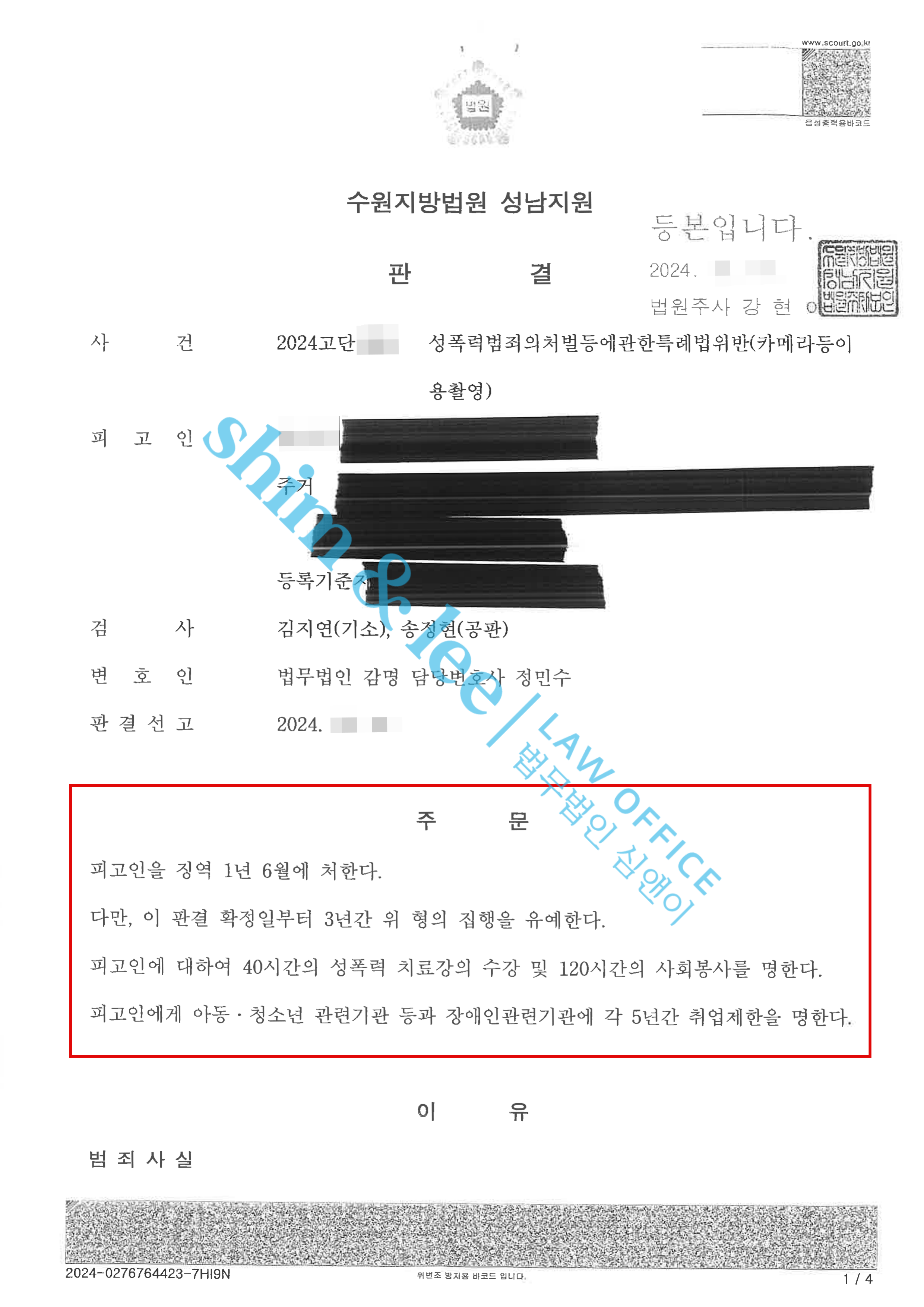 - 의뢰인님은 부가형까지 잘 붙어 나온 선고 결과에 정말 만족하셨으며 꼼꼼하게 사건을 진행해주고, 선택에 기로에 서있을 때 피해자가 최선의 선택을 할 수 있도록 옆에서 조력해준 심앤이에 감사를 표하셨습니다.