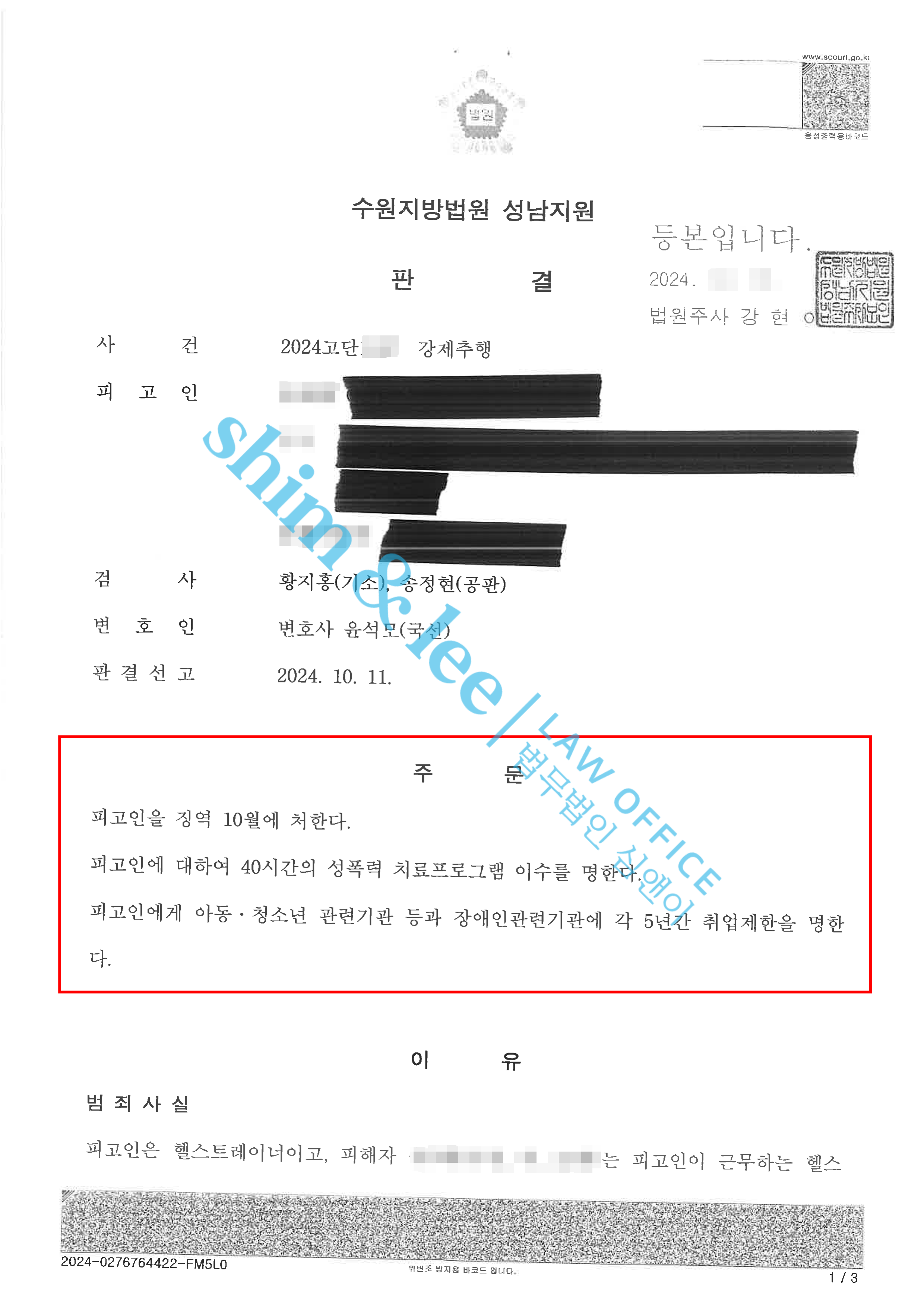 취업제한 3년 / 성폭력 치료강의 40시간 -