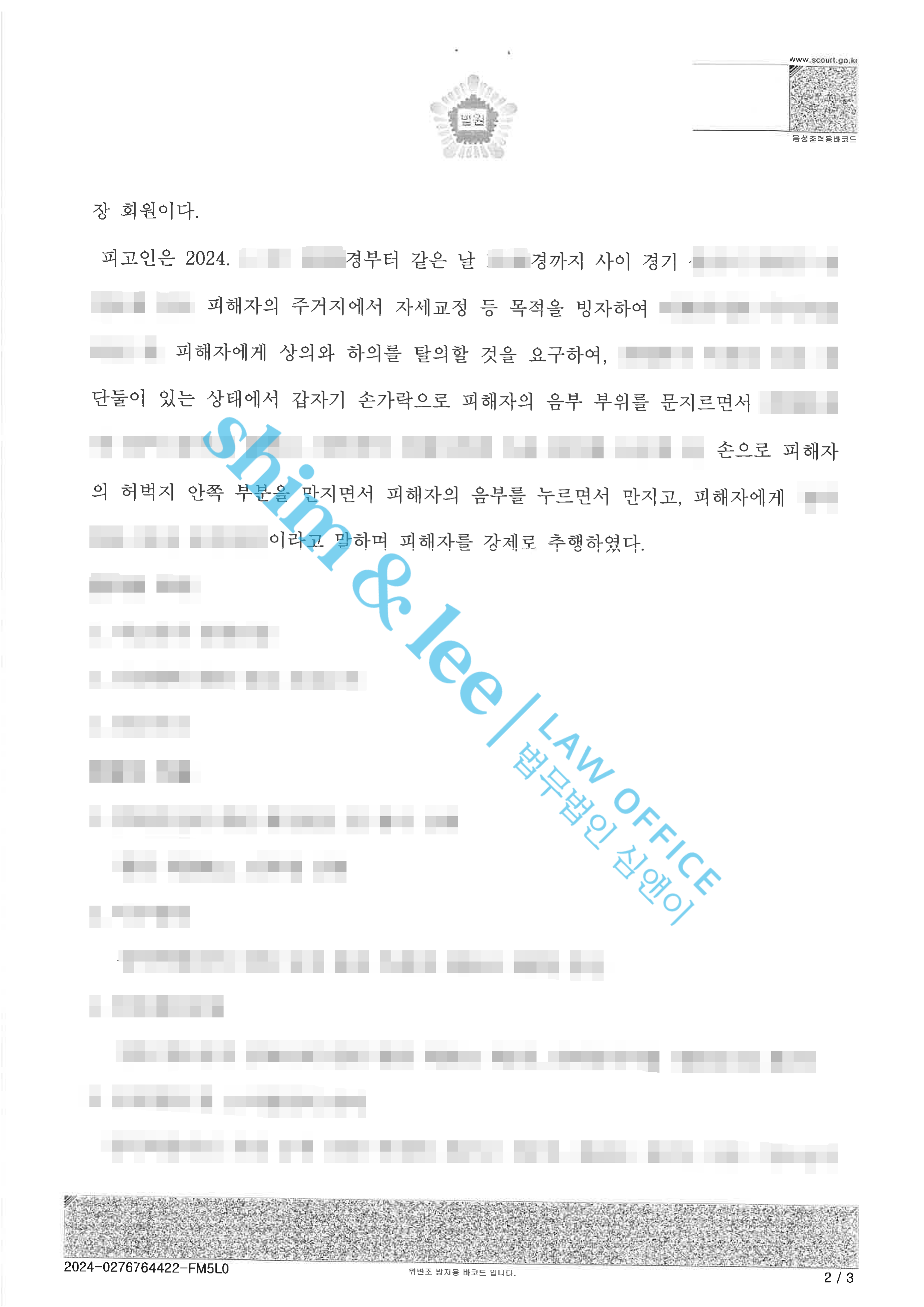- 가해자는 운동을 가르쳐 준다는 핑계로 의뢰인의 집에 들어와 성적인 발언과 함께 불필요한 터치를 하며 옷을 탈의하길 요구하고, 음부를 만지는 등 수치심을 주는 행동으로 의뢰인을 추행하였습니다.