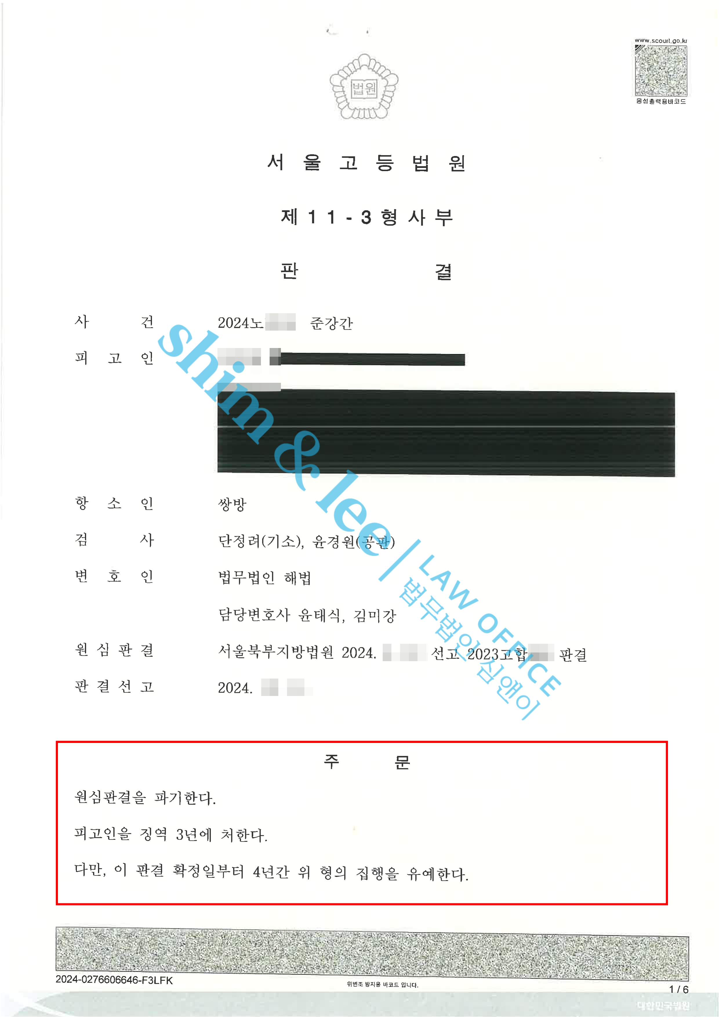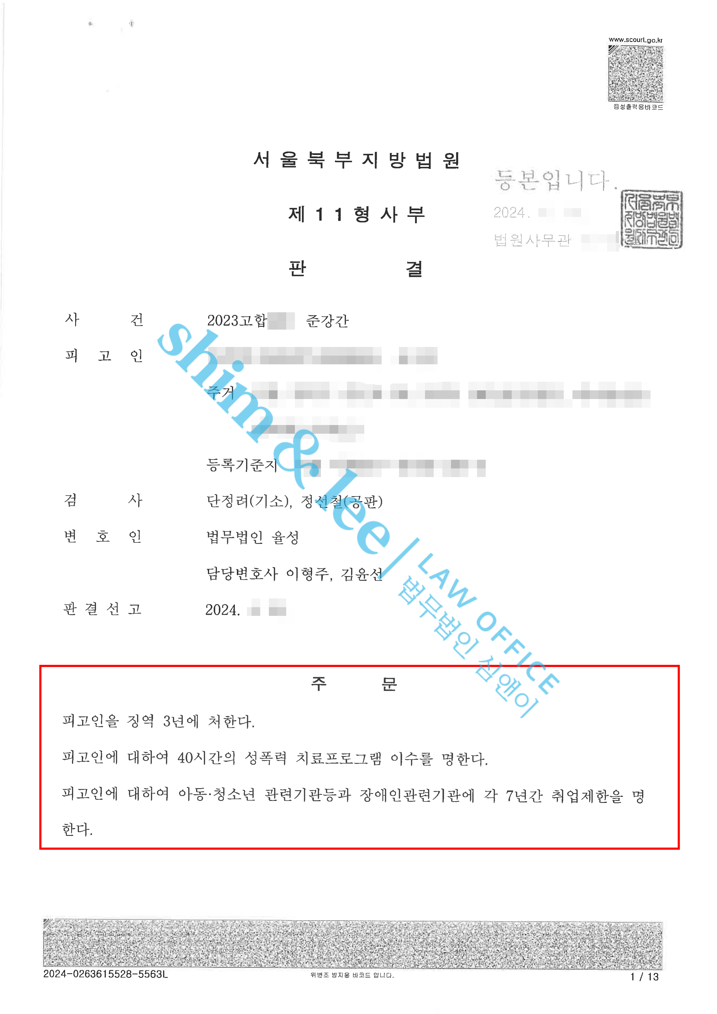 - 의뢰인님은 본인에 대한 정보를 공개하지 않아 이후 보복에 대한 걱정도 없고 가해자가 큰 금액에 합의를 했음에도 중형을 선고받아 그동안의 마음을 위로받는 느낌이라고 변호사님과 송무팀 그리고 운영팀에 감사의 말씀을 전했습니다.