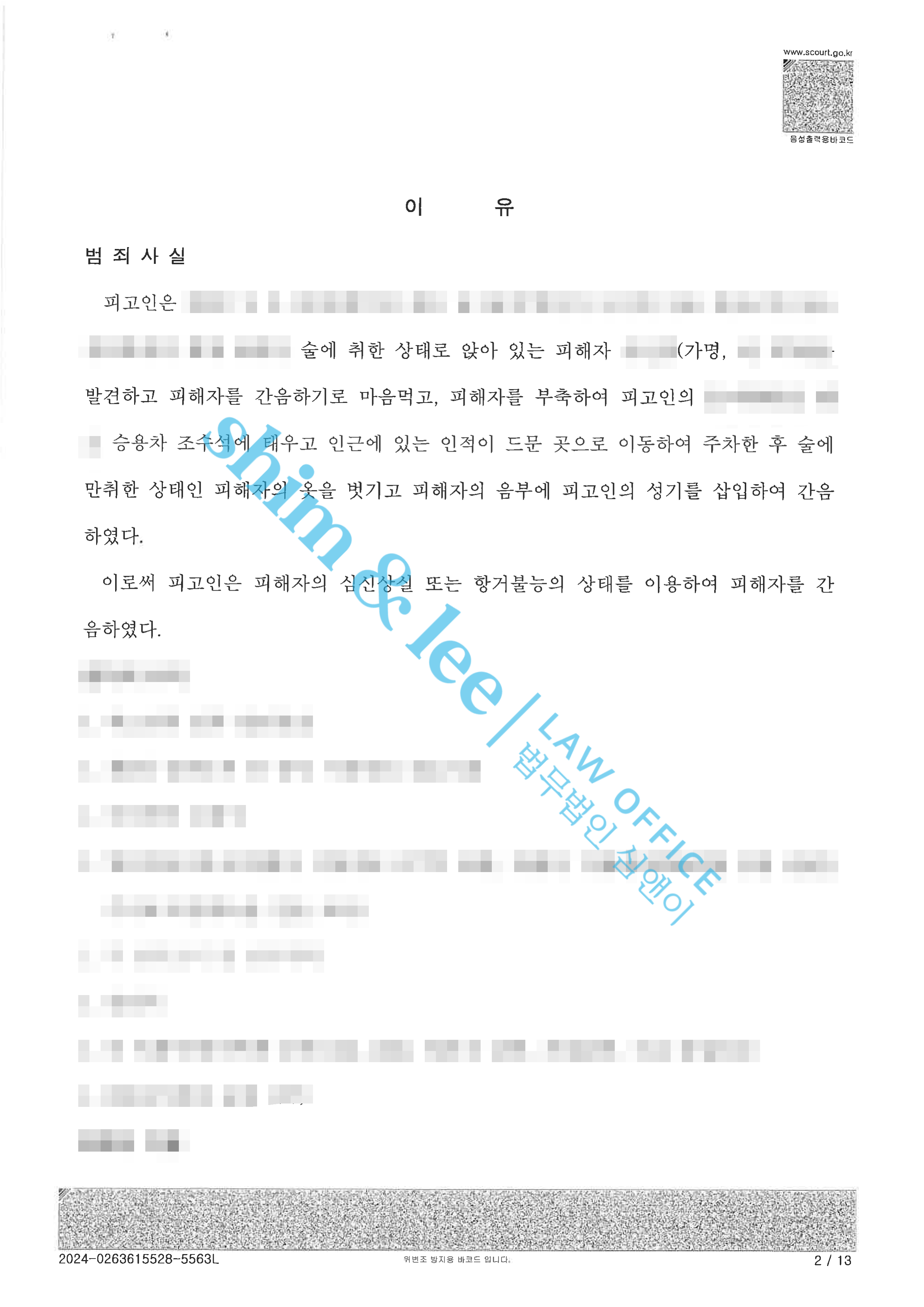 고소 전 합의대행유부남 직장 상사의 준강간, 고소 전 합의대행 2023.08.12합의금 2,000만 원 -