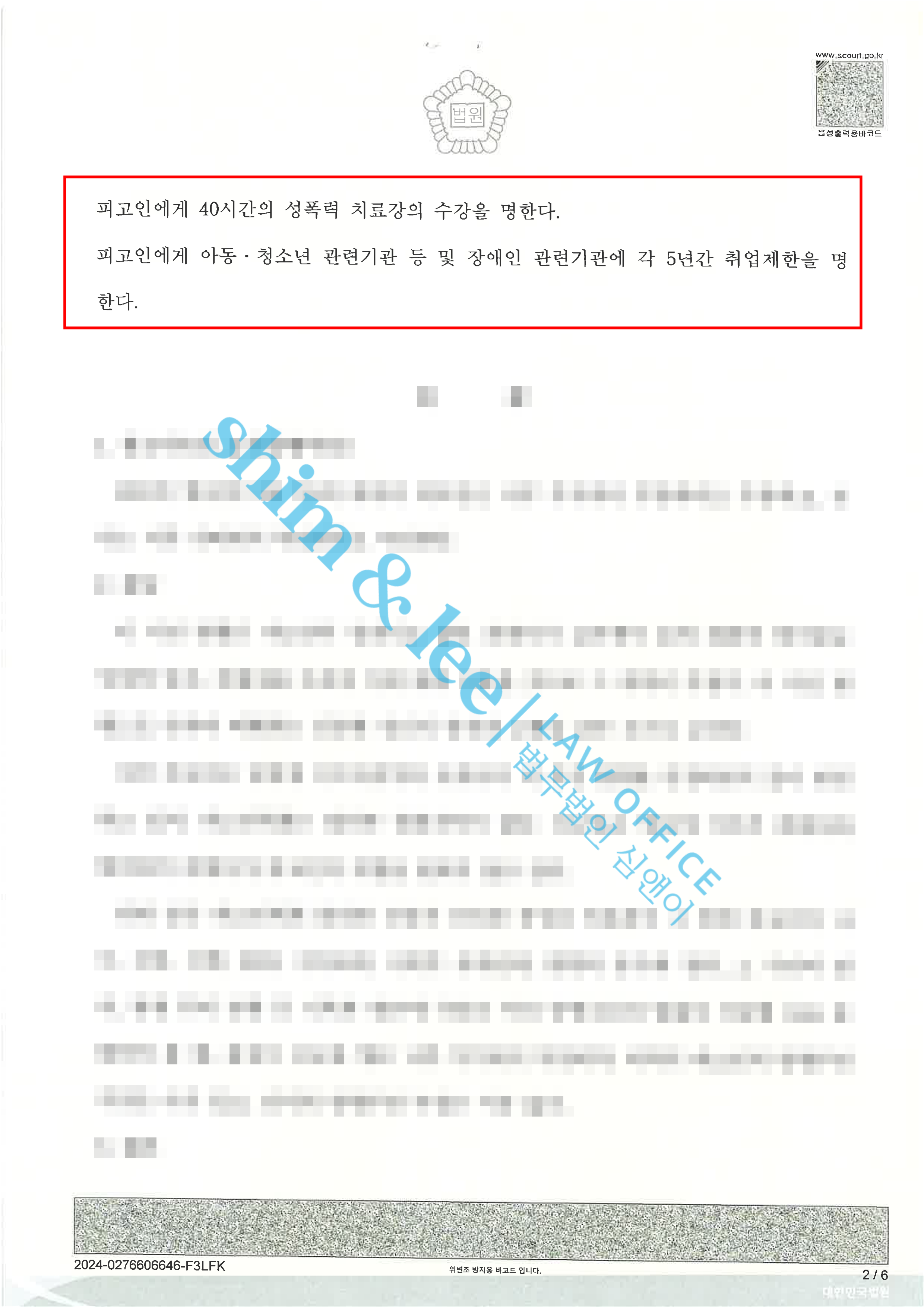 성폭력 치료강의 40시간 / 취업제한 5년 -