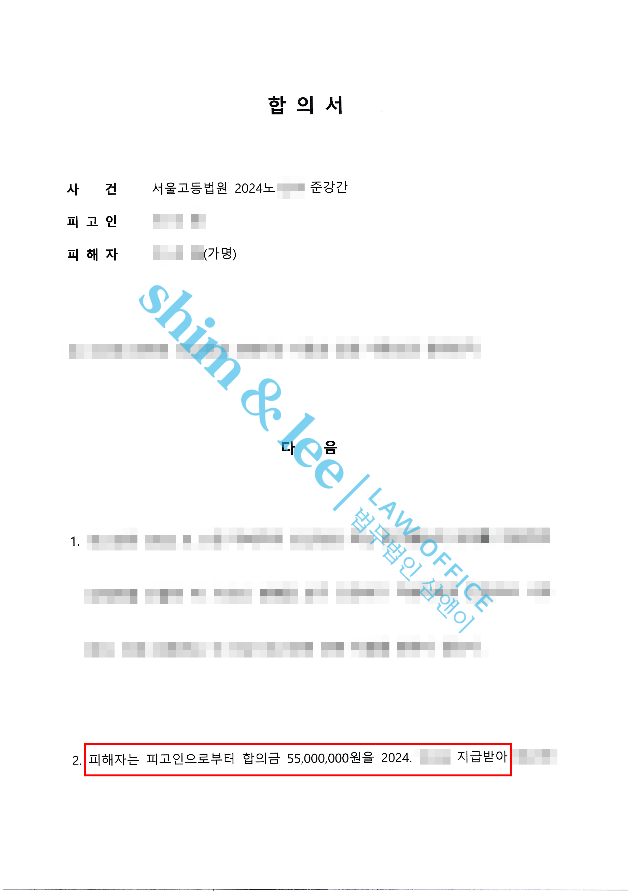 - 재판 진행 중 대표변호사님은 가해자 변호인과 직접 소통하며 접근금지, 보복금지와 통신제한 그리고 비밀유지 조항을 넣은 합의서를 작성하였고 위약벌 조항까지 넣어 5천5백만 원이라는 높은 금액으로 합의를 진행했습니다. 또한 가명으로 사건을 진행했던 의뢰인님께서는 계좌를 가해자 혹은 가해자의 변호인 측에 알리는 것을 꺼려 하셨으며 그런 의뢰인님의 마음을 헤아려 심앤이 법인 계좌로 합의금을 대신 받아 의뢰인님에게 전달했고 의뢰인님에 대한 정보는 일체 공개되지 않도록 하였습니다.