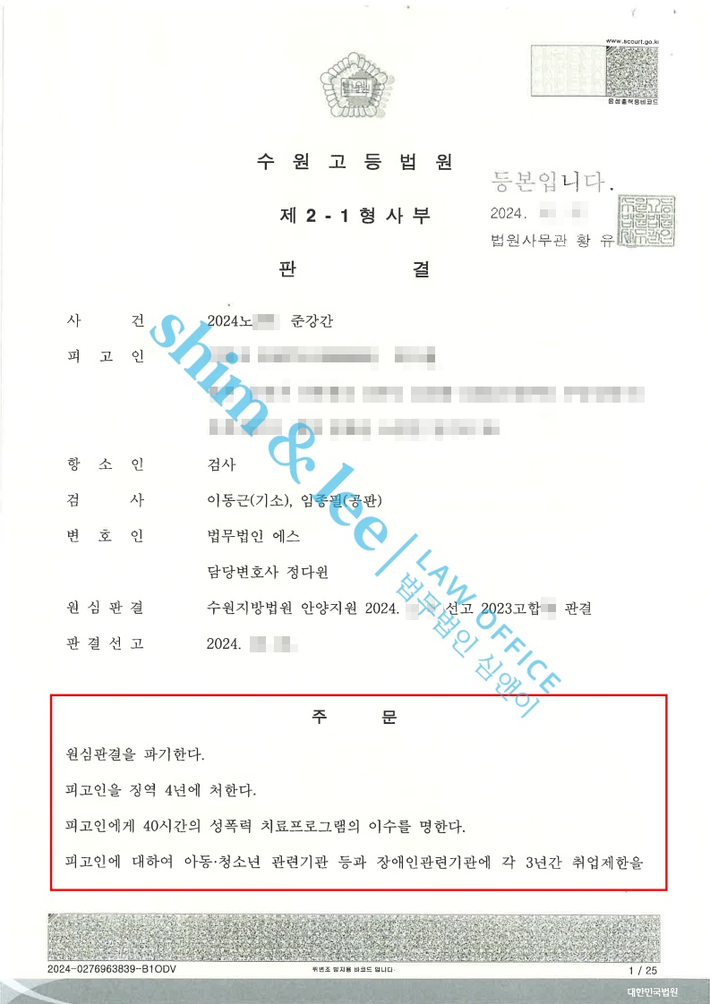 가해자에게는 징역4년, 성폭력 치료강의 40시간의 수강명령, 취업제한 3년의 실형이 선고되었습니다.