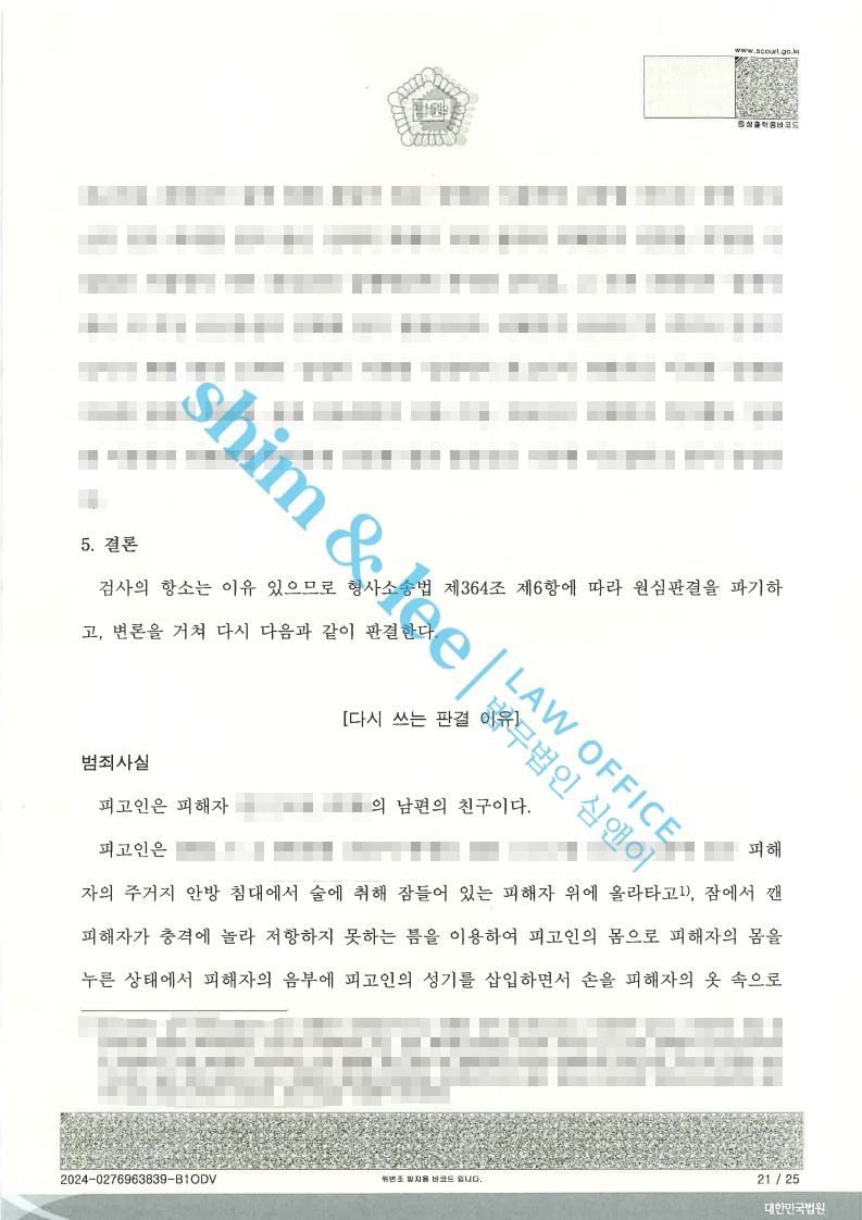 1. 의뢰인의 증인신문 기일에 함께 동행하여 유리한 정황과 불리한 정황을 세심하게 파악하셨고, 피해자 변호사 최종 의견으로 ①피해자 진술의 신빙성을 배척한 4가지 주된 이유를 하나하나 지적하였고 ②특히 피고인과 남편을 오인하였을 가능성에 대해 성관계를 할 정도로의 가까운 신체적 접촉을 하는 경우 오감으로 느끼는 전부를 착각하는 것은 매우 어렵고 ③피해자는 수사단계부터 현재에 이르기까지 눈을 떴을 때 가해자의 얼굴을 보았다는 것을 명확하게 진술하고 있다는 점을 살펴봐 주시기를 직접 진술하여 재판부를 적극적으로 설득해나갔습니다.