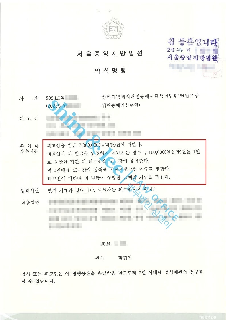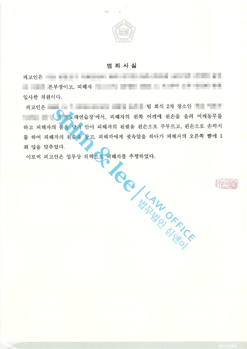 - 이후 담당 변호사는 피해자 엄벌탄원서와 함께 가해자는 사내 지위를 이용해 피해자를 강제 추행하고 추행의 정도가 극심하다는 점을 강조하는 변호사 의견서를 검찰에 제출했고, 검찰에서는 가해자에 대하여 약식 기소처분을 했습니다. 이에 가해자는 벌금형을 조금이라도 낮출 목적으로 정식재판청구를 하지만 금새 정식재판청구취하서를 제출하게 됩니다.
