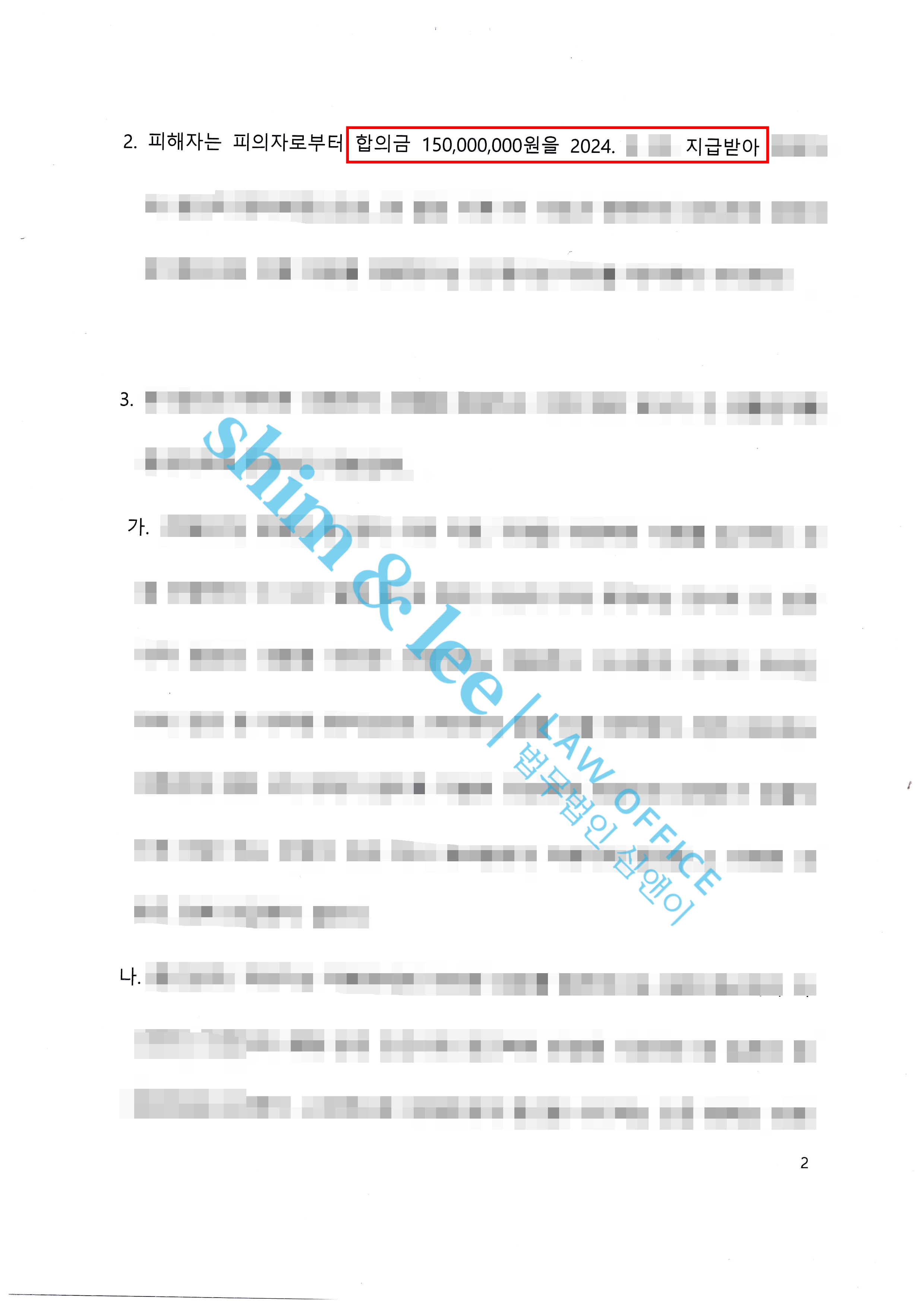 3) 이에 경미한 부위의 추행이라고 주장하던 가해자는 합의를 요청해왔으며 사내에서 굉장히 높은 직급의 사람이었기에 실형을 무서워하는 가해자의 심리를 이용하여 높은 금액으로 합의를 성사시키고자 하였습니다. 대표변호사님은 상대 측과 직접 소통하여 수차례 걸친 협상 끝에 합의금을 1억 5천만 원까지 증액하였으며 이밖에도 비밀유지, 접근금지, 통신제한, 소제기 금지 등 피해자에게 유리한 여러 조항을 추가하여 합의를 진행했습니다. -