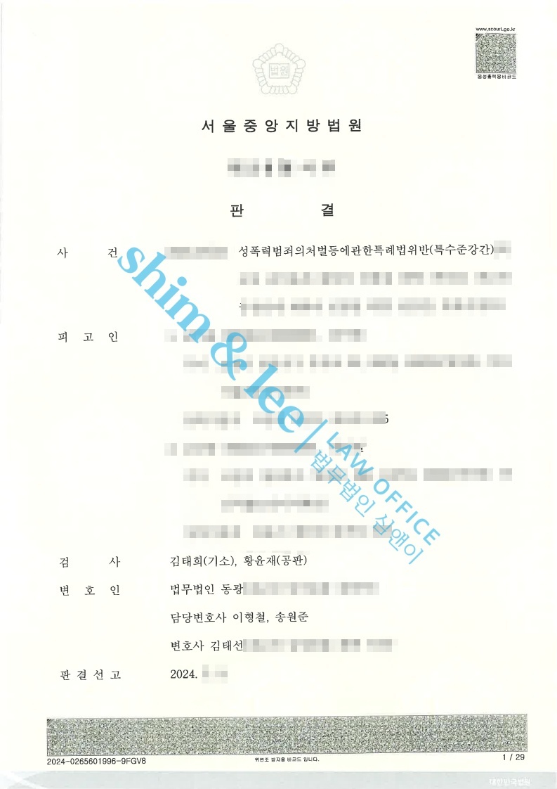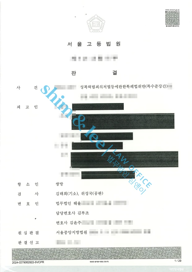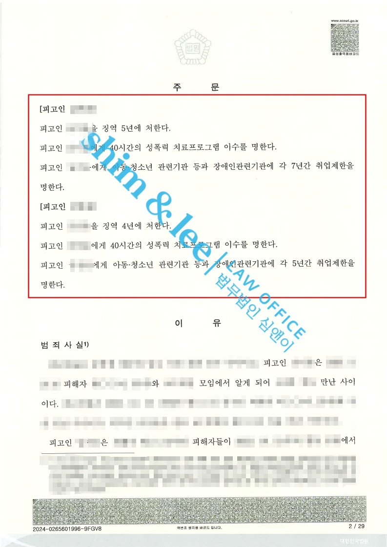 - 가해자들은 의뢰인님과 가까스로 합의를 하게 되어 최종적으로 2심에서는 1) 가해자 1에 대하여는 징역 3년, 성폭력 치료프로그램 40시간, 취업제한 5년의 실형이 선고되었습니다.