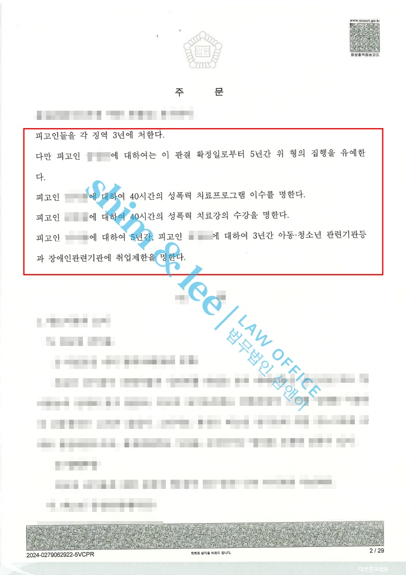 2) 가해자 2에 대하여는 징역 3년 집행유예 5년, 성폭력 치료프로그램 40시간, 취업제한 3년의 중형이 선고되었습니다.
