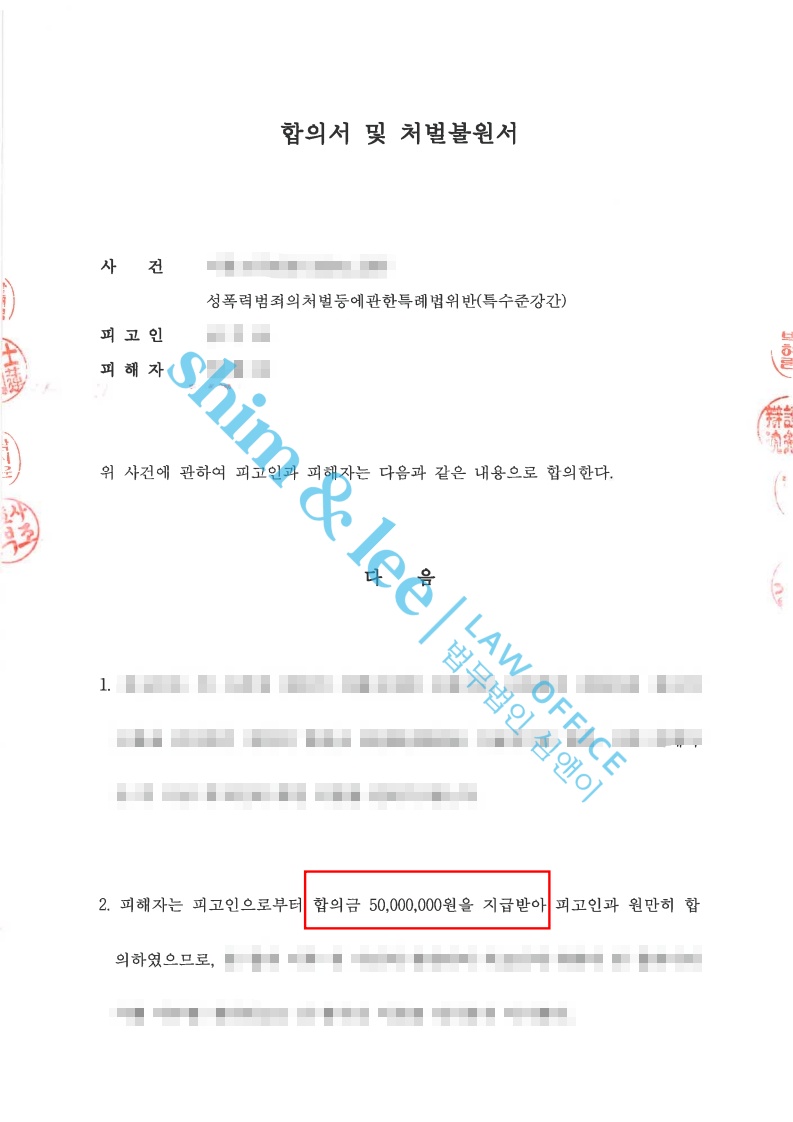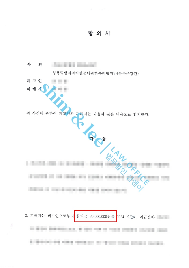 - 1심에서 무죄를 주장하던 가해자는 2심에서는 혐의 인정하고 정식으로 합의를 제안했습니다. 대표 변호사님은 보복금지/접근제한/통신제한/비밀유지 등 부가조건까지 꼼꼼하게 합의서를 작성했고 최종 3천만 원으로 합의를 진행했습니다.