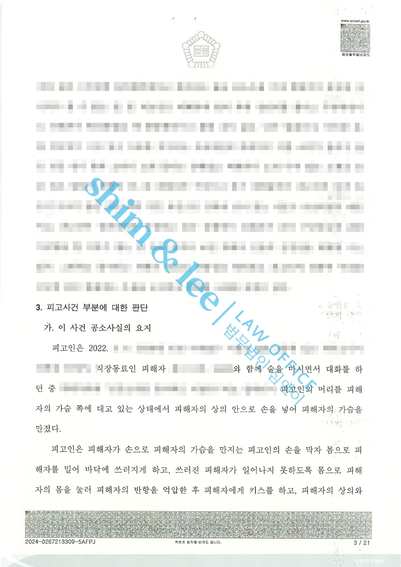형사고소대학 동기인 가해자와 술을 먹던 중 기습적으로 추행당한 사례 2021.11.23합의금 2,000만 원 -