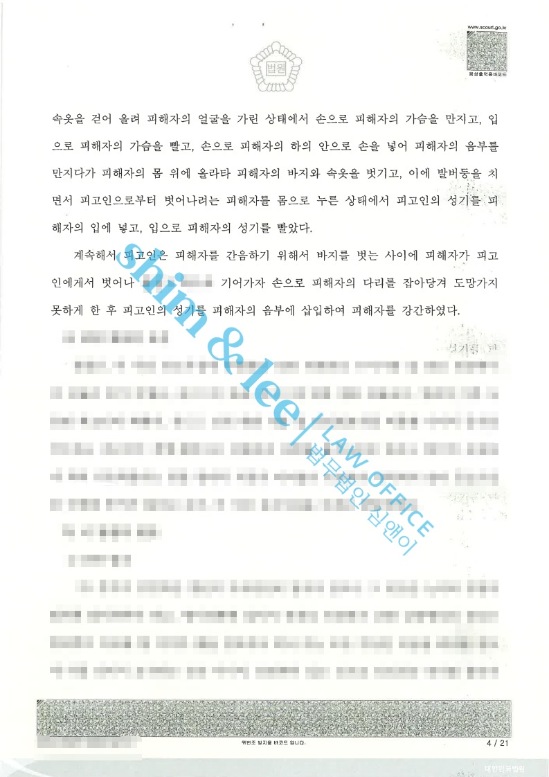 -그렇게 술을 마시며 직장 스트레스에 대해 얘기를 나누던 도중, 가해자는 의뢰인의 가슴을 만지며 추행을 시작하였고, 자리를 피하려는 의뢰인을 힘으로 제압하여 자신의 성기를 피해자의 입에 넣었고 가해자가 바지를 벗는 사이 도망가려는 의뢰인의 다리를 붙잡아 도망가지 못하게 한 후 간음을 하였습니다.