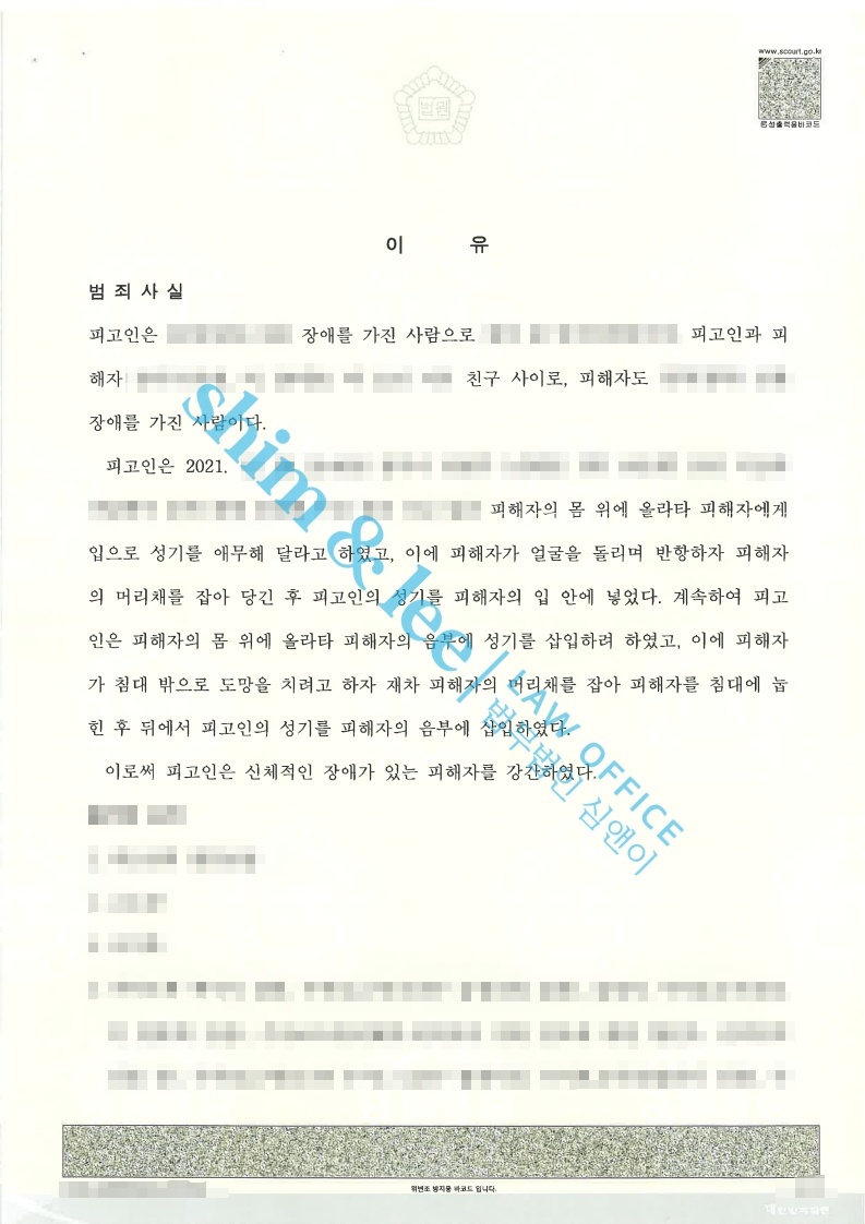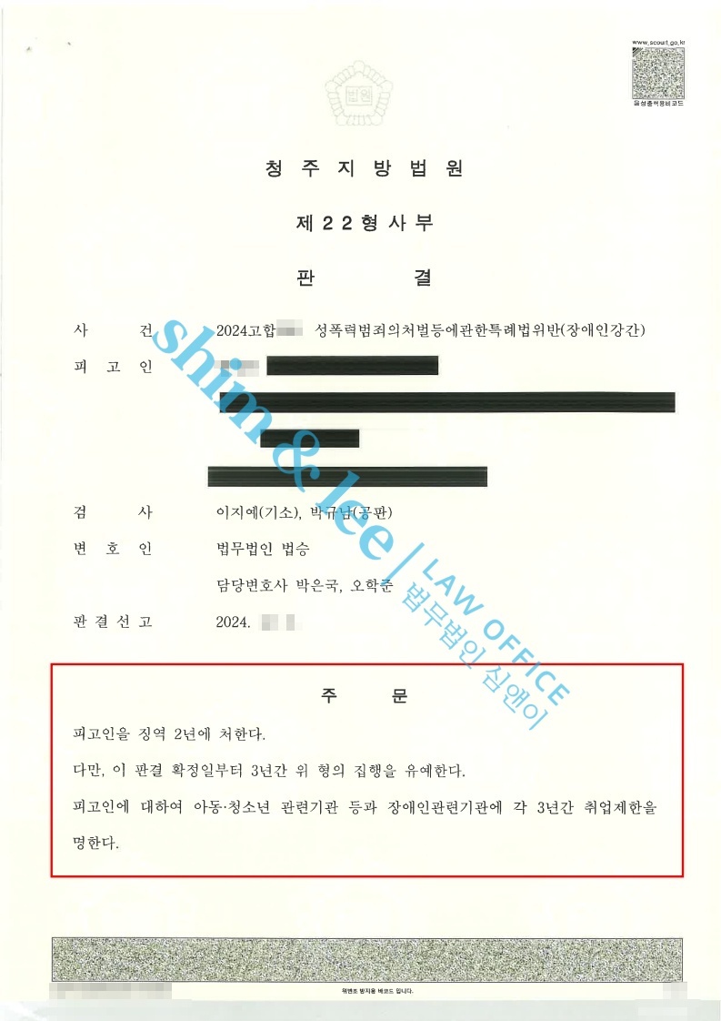 -또한, 의뢰인의 의사에 반하여 강제로 간음을 하였다는 점이 인정되어 징역 2년, 집행유예 3년, 아동, 청소년 관련기관과 장애인 관련기관 취업제한 3년의 선고가 내려졌습니다.