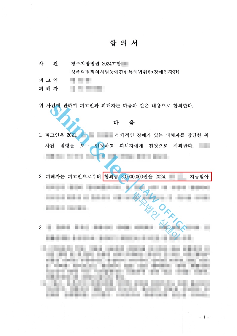 -점점 공판 날짜가 다가오고, 구속의 가능성을 인지한 가해자는 처음 제안해온 금액보다 3배 증액하여 총 3천만 원으로 합의를 요청하였고, 이에 비밀유지, 접근금지, 통신제한 등 의뢰인에게 유리한 조항을 추가하고, 가해자의 사과문까지 받아 합의를 진행하였습니다.