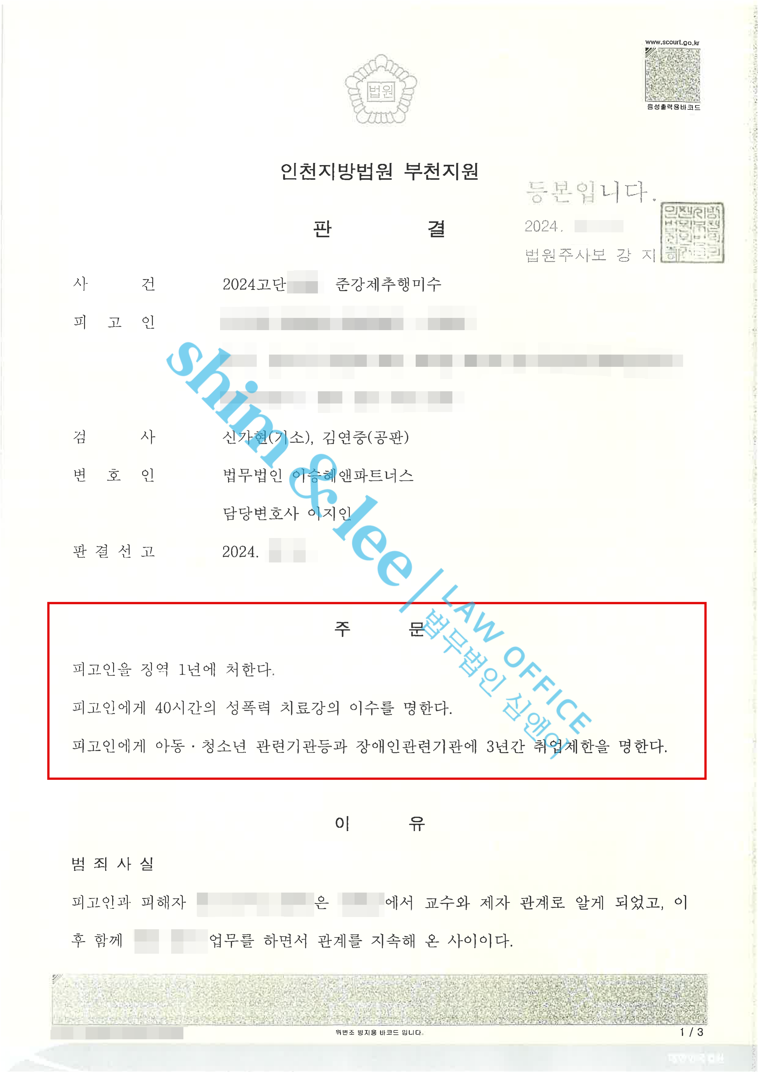 - 재판부는 신뢰관계에서 발생한 점, 피해자가 항거불능 상태에서 발생한 점, 가해자의 죄질이 불량한 점, 천만 원을 공탁했지만 피해자가 이를 수령할 의사가 없는 점, 그리고 엄벌만을 탄원하는 점을 이유로 들며 가해자에게 징역 1년, 성폭력 치료강의 40시간, 취업제한 3년, 신상정보등록을 선고했습니다.
