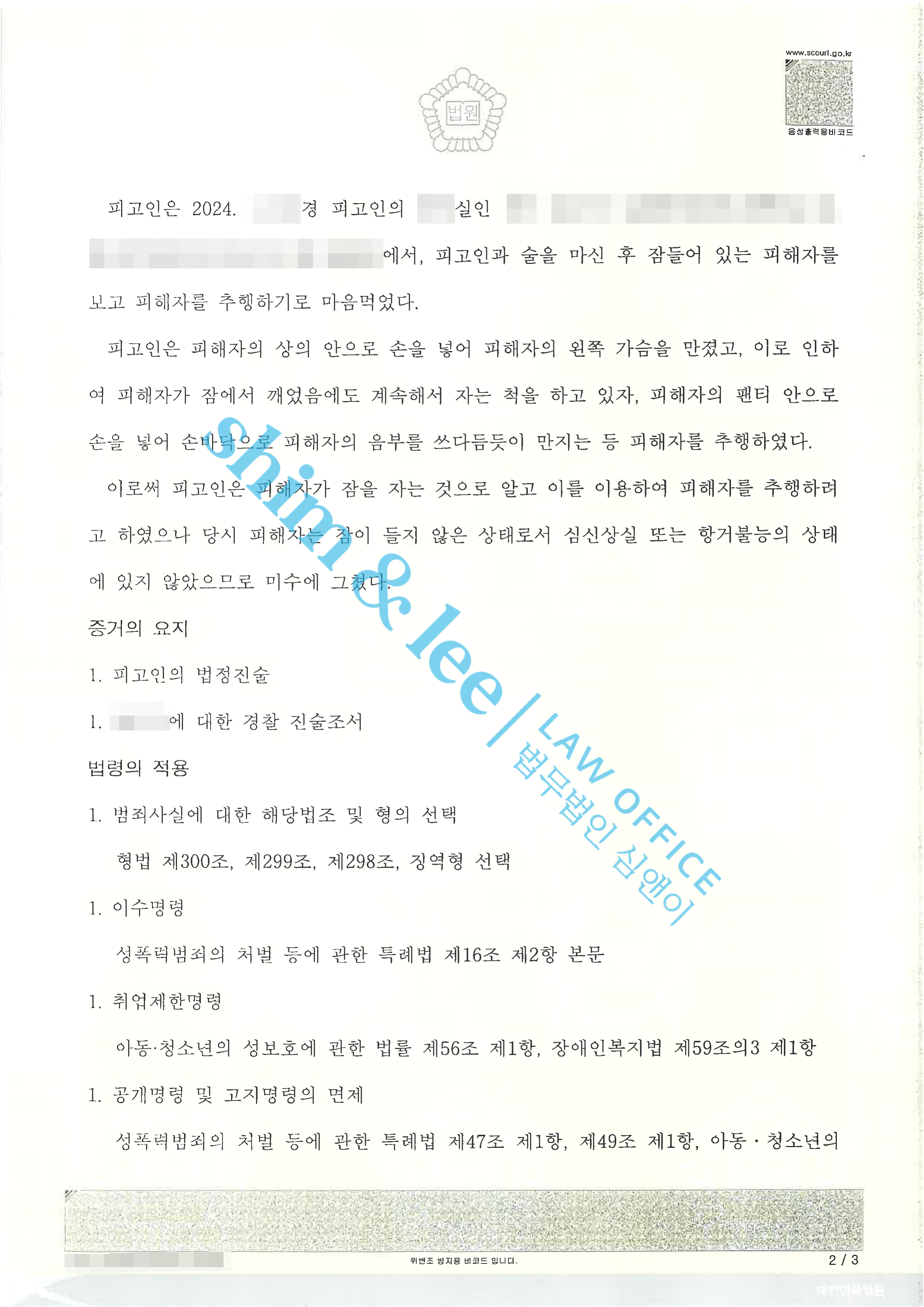 합의대행피해자가 술에 취해 잠든 줄 알고 유사강간한 사례 2022.04.05징역 1년 6월 / 집행유예 3년