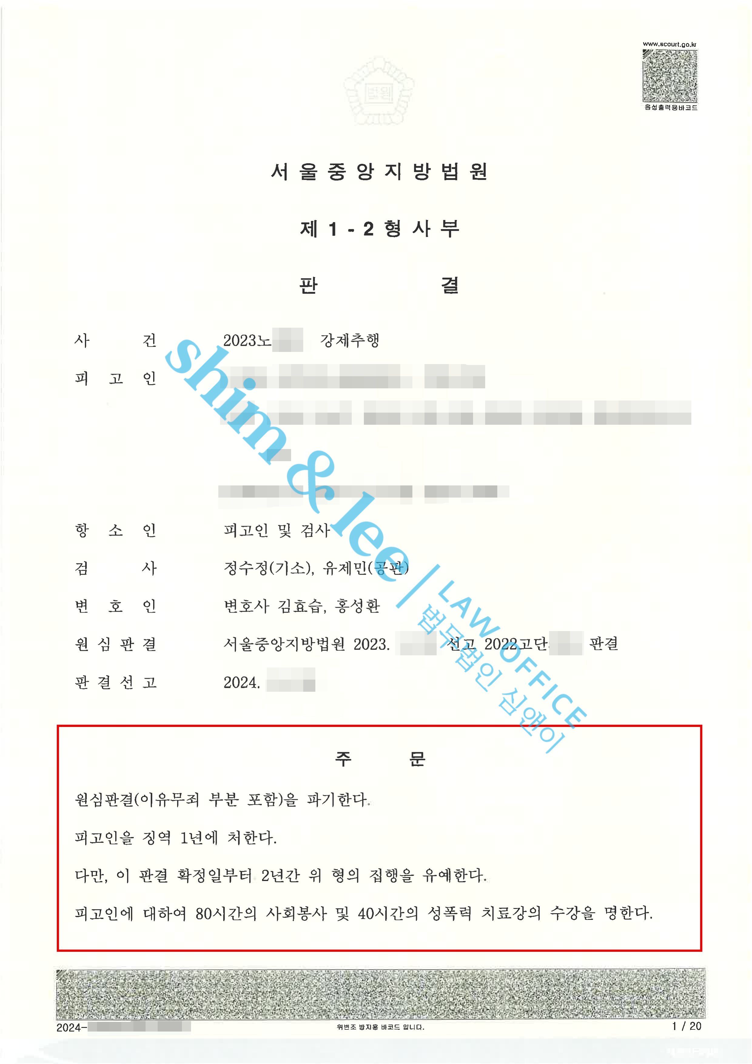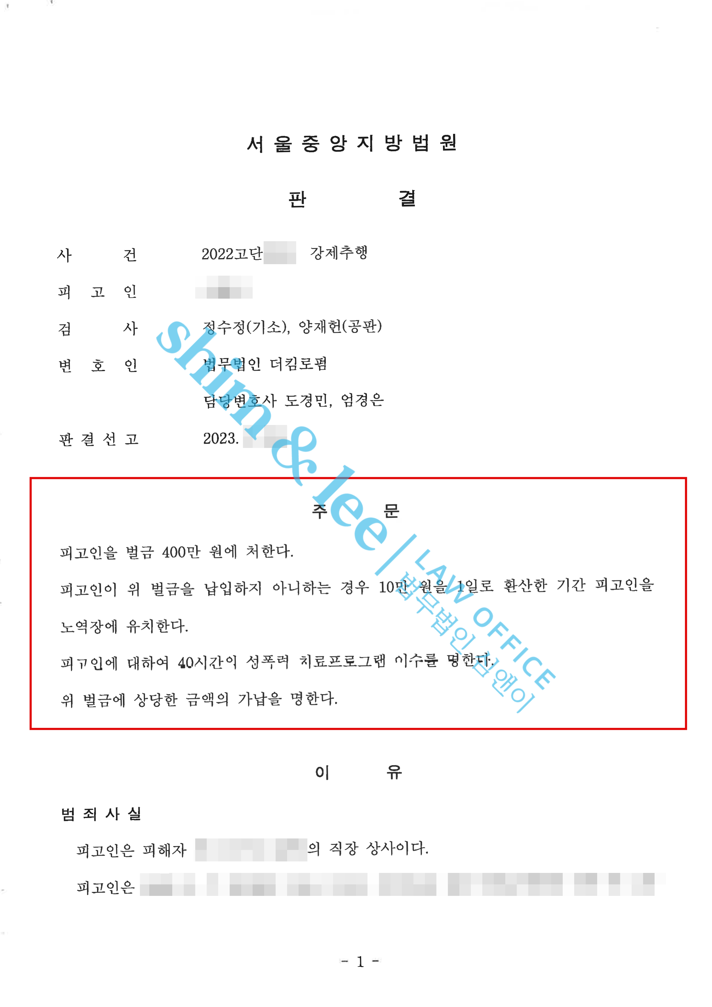 형사고소회사 임원이 신입 사원을 강제추행한 사건 2025.11.21징역 1년 / 집행유예 2년