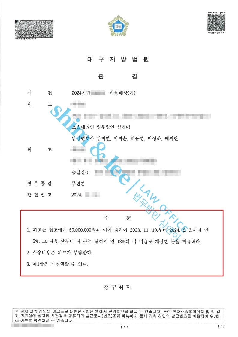 -송무팀의 노력으로 판사님의 직권에 의해 재송달될 수 있었고 마침내 피고에게 소장이 송달되었습니다. 피고는 소장을 받고 답변서를 미제출하며 무변론 판결 선고로 소송은 빠르게 진행되었고, 판결 선고기일에는 심앤이가 청구했던 금액 5천만 원이 전부 인용되었습니다.