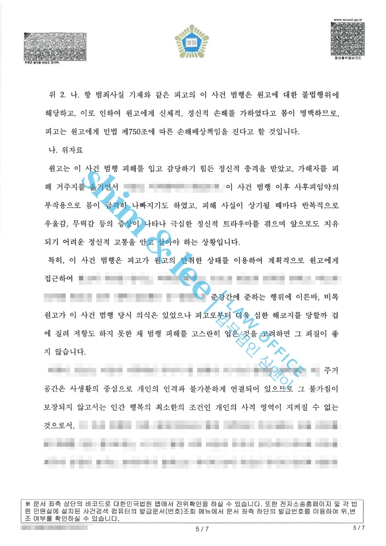 2) 또한, 피고는 원고가 술에 취한 상태인 점을 이용하여 아무런 동의도 구하지 않고 범행을 저질렀으면서도 이를 인정하지 않고 합의된 성관계라고 주장하며 사건 진행을 더디게 하여 2차 가해를 하였다는 점을 전달드리며 원고의 정신적 피해 보상에 대한 위자료 책임이 있다는 점 또한 재판부에 호소하였습니다.