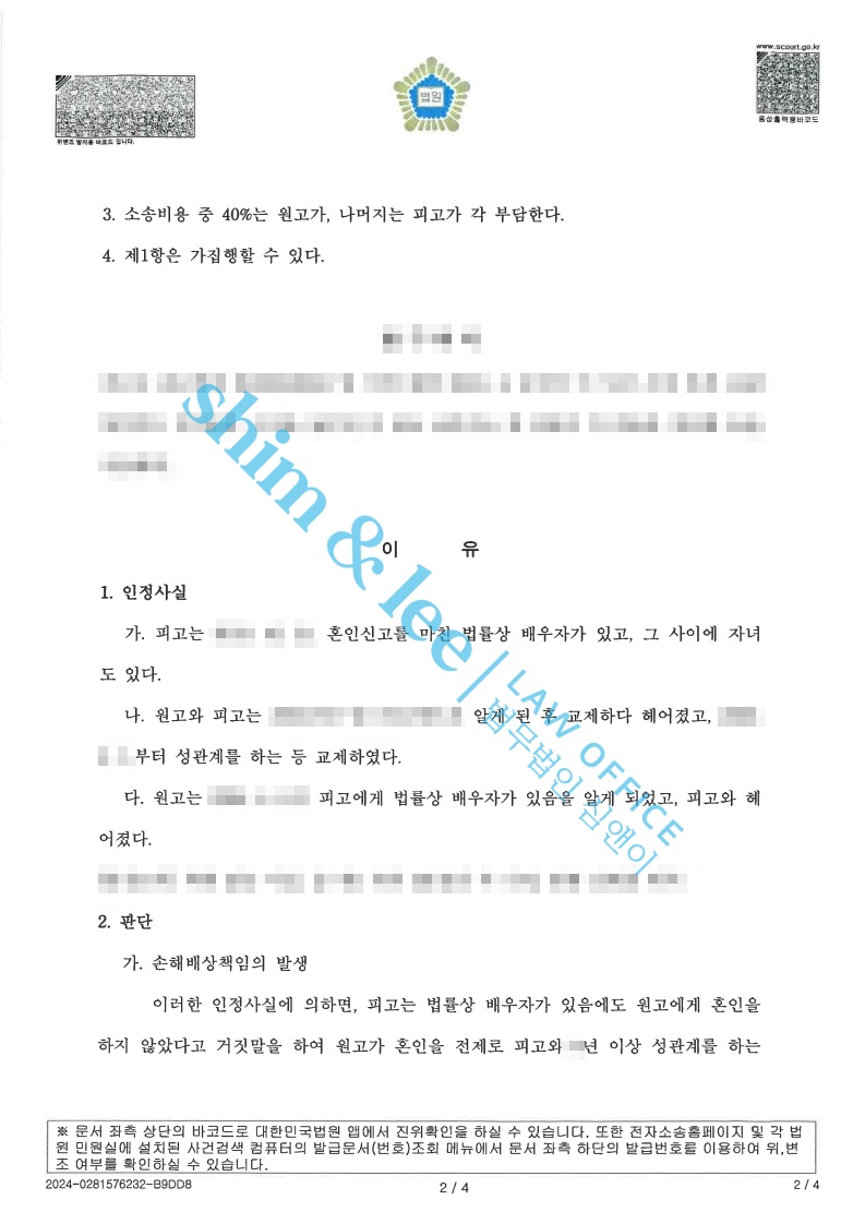 - 자료를 확인한 후 피고의 불법행위의 경위와 이로 인해 의뢰인이 정신적 피해를 입은 것에 대해 위자료를 청구하는 소장을 접수하였습니다. ① 유사 판례를 인용하여, 피고는 수년간 유부녀임을 숨기고 원고와 성관계를 하며 결혼을 전제로 교제한 것은 원고의 성적자기결정권을 침해하는 불법행위에 해당하는 점, ② 피고는 원고에게 여러 차례 결혼을 제안하고 원고의 가족들을 직접 만나기도 했으나 자신의 이름부터 자녀 수, 결혼사실 등을 모두 숨긴 채 적극적으로 기망한 점, ③원고는 피고의 불법행위로 성적 자기결정권이 심각하게 침해되었고, 피고는 진심 어린 반성을 하는 등 원고에게 피해회복을 전혀 하고 있지 않는 점을 주장하여 피고에게 높은 위자료를 인용해 달라고 재판부에 호소하였습니다.