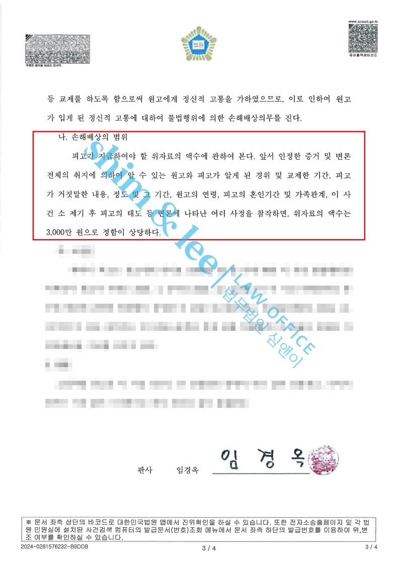 - 법원은 성적자기결정권침해로 인한 손해배상액으로는 유례없이 매우 높은 액수인 3,000만 원을 위자료로 인정해주었습니다. 또한 피고가 법률상 배우자가 있다는 사실을 알게 된 날로부터 지연 이자를 붙여 배상하도록 명하였습니다.