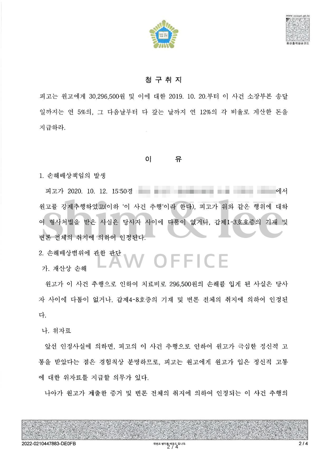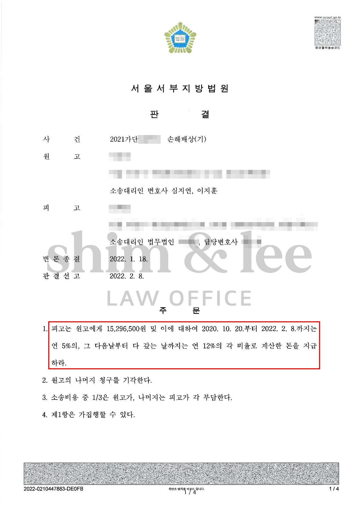 또한 번거로운 집행절차를 거치지 않도록 심앤이가 가해자측 변호사와 직접 협의하여 승소액을 한 번에 모두 지급받고 최종적으로 사건을 마무리했습니다.