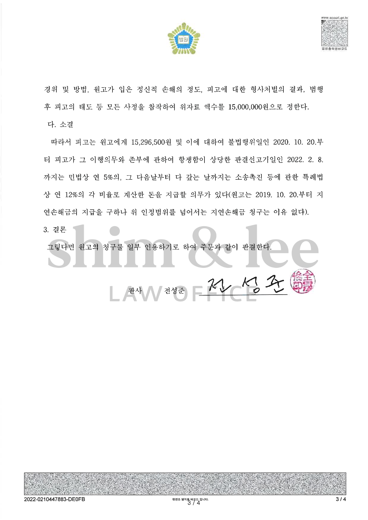 민사소송SNS 딥페이크 성범죄 피해, 위자료 손해배상 청구한 사건 2025.11.07손해배상금 1,000만 원 -