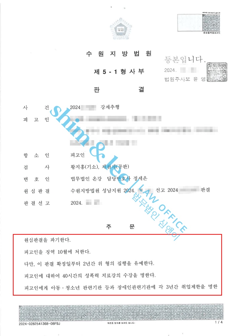 - 피고인은 법정구속 후 6개월 동안 구금 생활을 이어가던 중 가까스로 피해자와 합의에 이르게 되었습니다. 최종적으로 항소심에서는 징역 10개월에 집행유예 2년, 성폭력 치료강의 40시간 수강, 그리고 취업제한 3년형이 선고되었습니다.