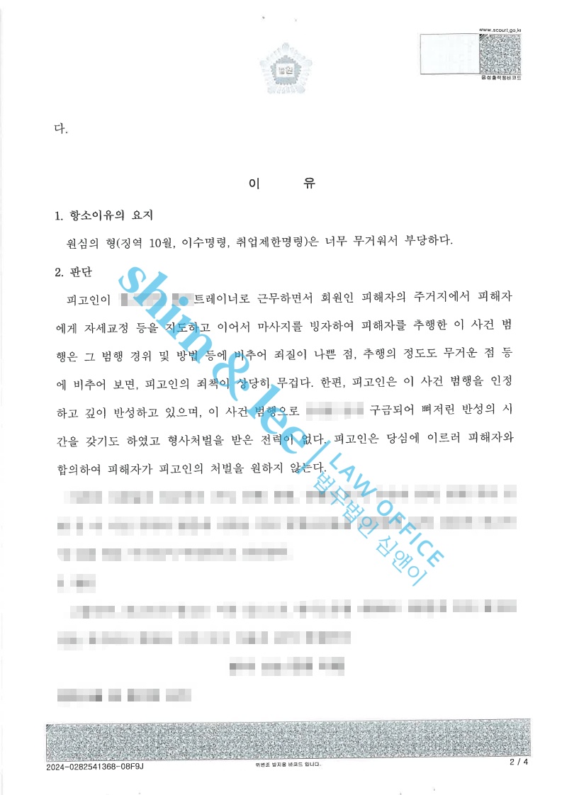형사고소마사지샵에서 강제추행 당한 사건 2025.10.17항소 기각