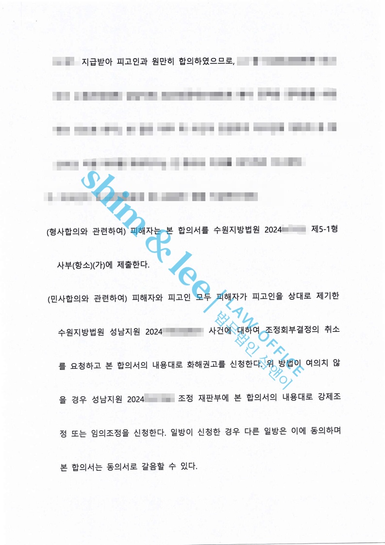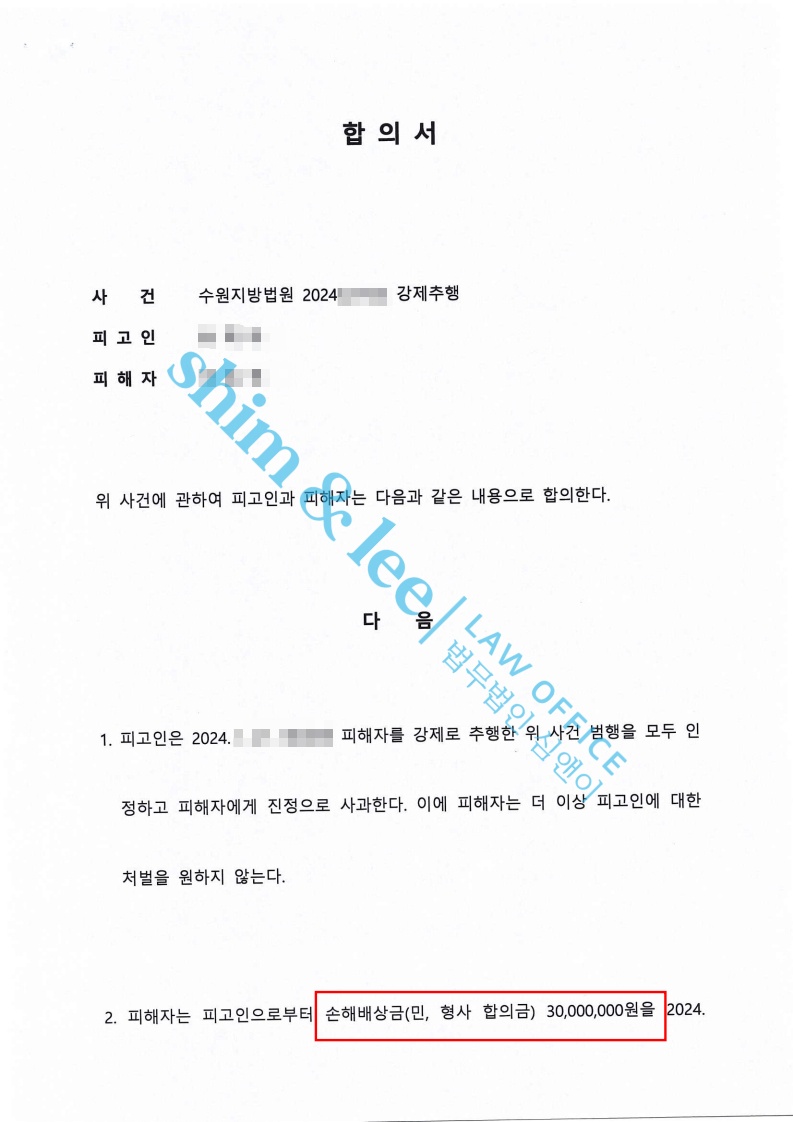 - 대표 변호사님의 단호한 태도에 합의가 결렬될 것을 우려한 피고인은 처음 제안했던 금액의 2배인 3,000만 원을 제안했습니다. 이에 더해 비밀유지, 접근금지, 통신제한 등의 부가 조항을 추가하여 피해자인 의뢰인에게 유리한 조건으로 합의가 진행되었습니다.