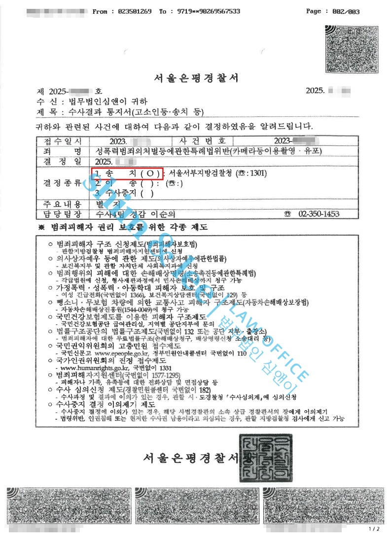 -가해자는 수사내내 일관되게 범행을 부인했지만, 결국 피해자의 동의 없이 온라인 상 불특정 다수에게 촬영물을 유포한 것이 인정되어 송치되었습니다.