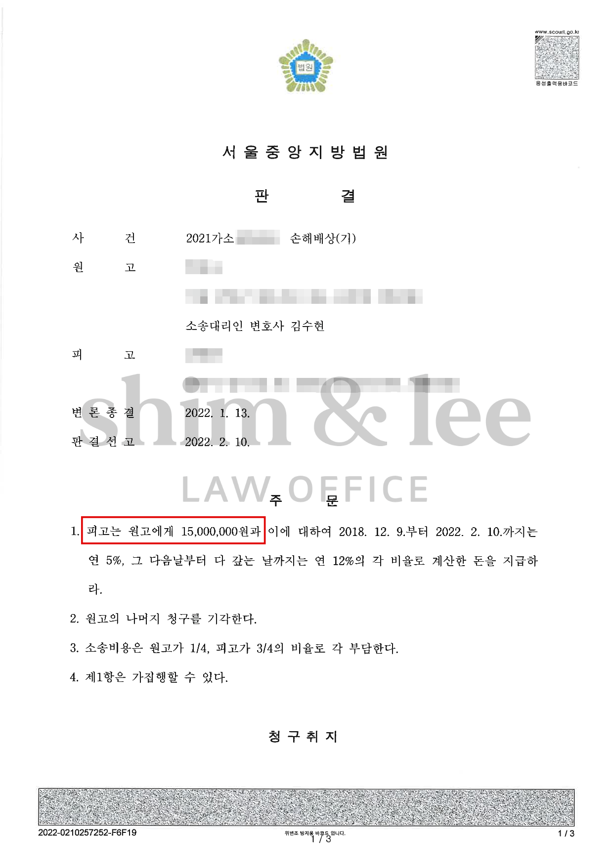 또한 번거로운 집행절차를 거치지 않도록 심앤이가 가해자측 변호사와 직접 협의하여 승소액을 한 번에 모두 지급받고 최종적으로 사건을 마무리할 수 있었습니다.