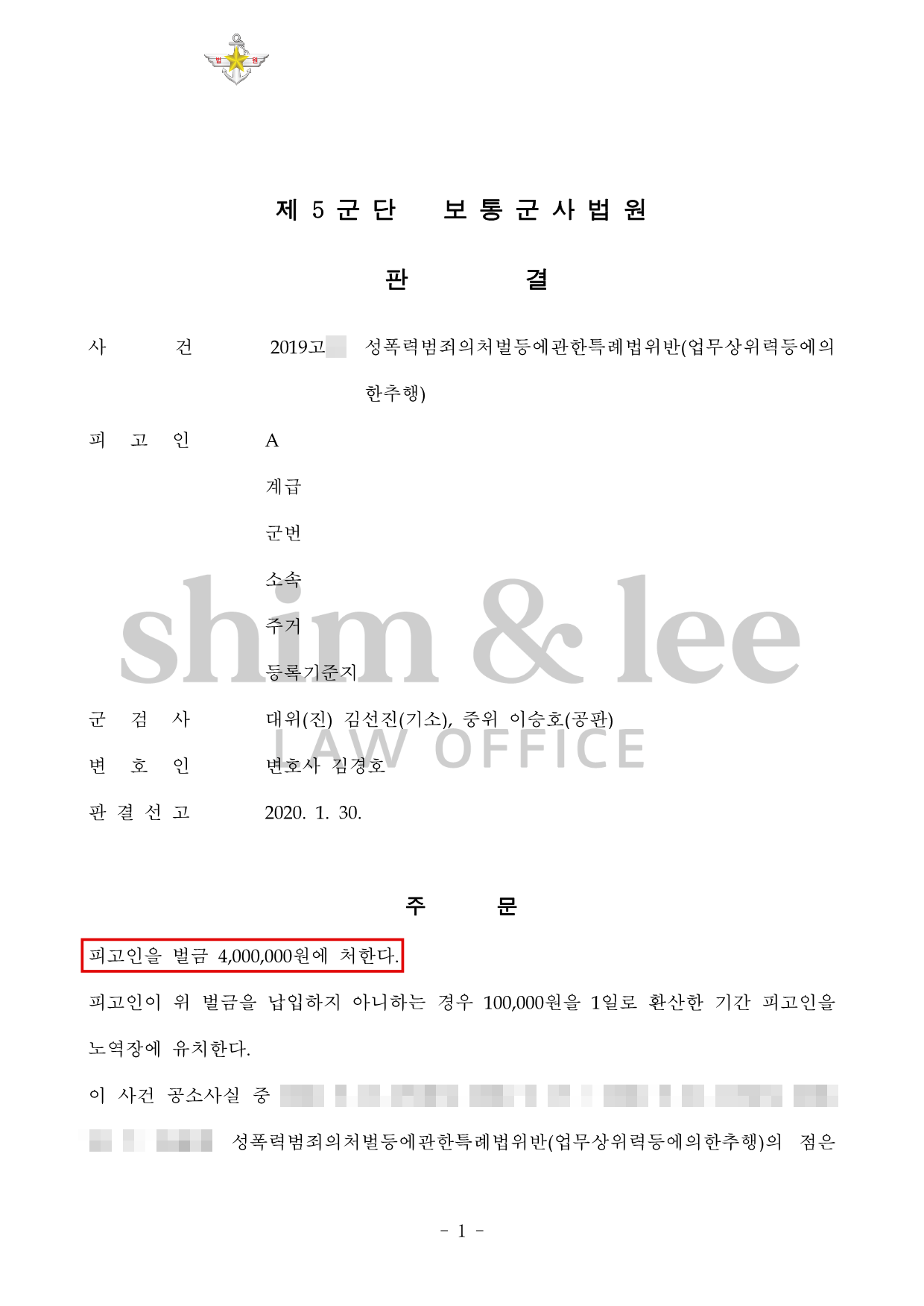 의뢰인은 훈련을 마치고 이제 막 부대에 전입한 20대 여성 간부였으며, 가해자는 의뢰인과 같은 부서 소속의 직속 상관인 40대 남성 간부였습니다.