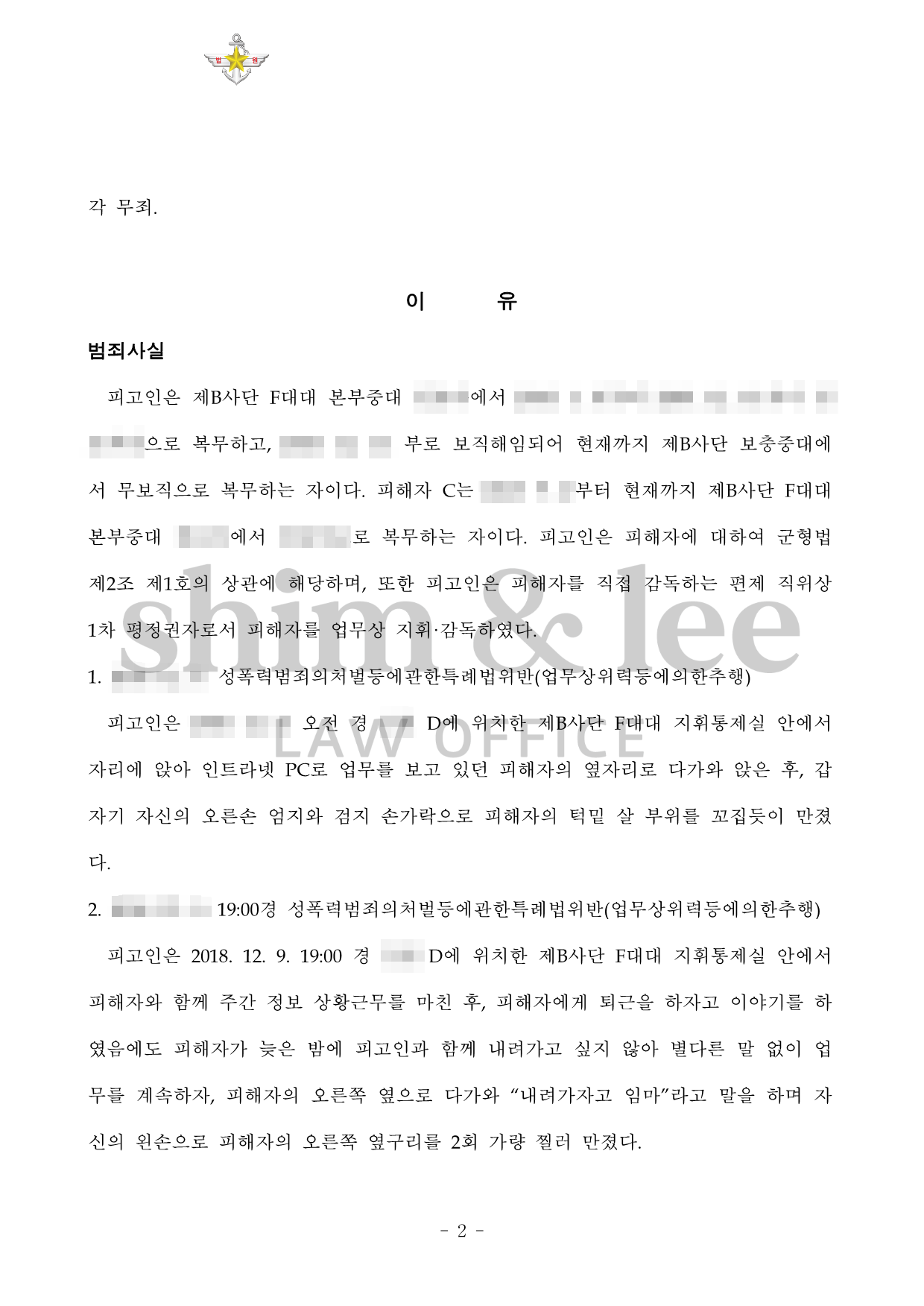 가해자가 군대 내 직속 상관이라는 점을 이용해서 노골적으로 자신의 인사권을 과시하는 위력 행사로 피해자를 압박했고, 비록 범죄행위로 인정되지는 않았지만 가해자의 범행 수법이 일상적인 신체접촉을 가장한 추행이라는 점에서 모든 행위가 추행으로 인정되어야 한다고 형사판결의 부당함을 논리적으로 입증했습니다.