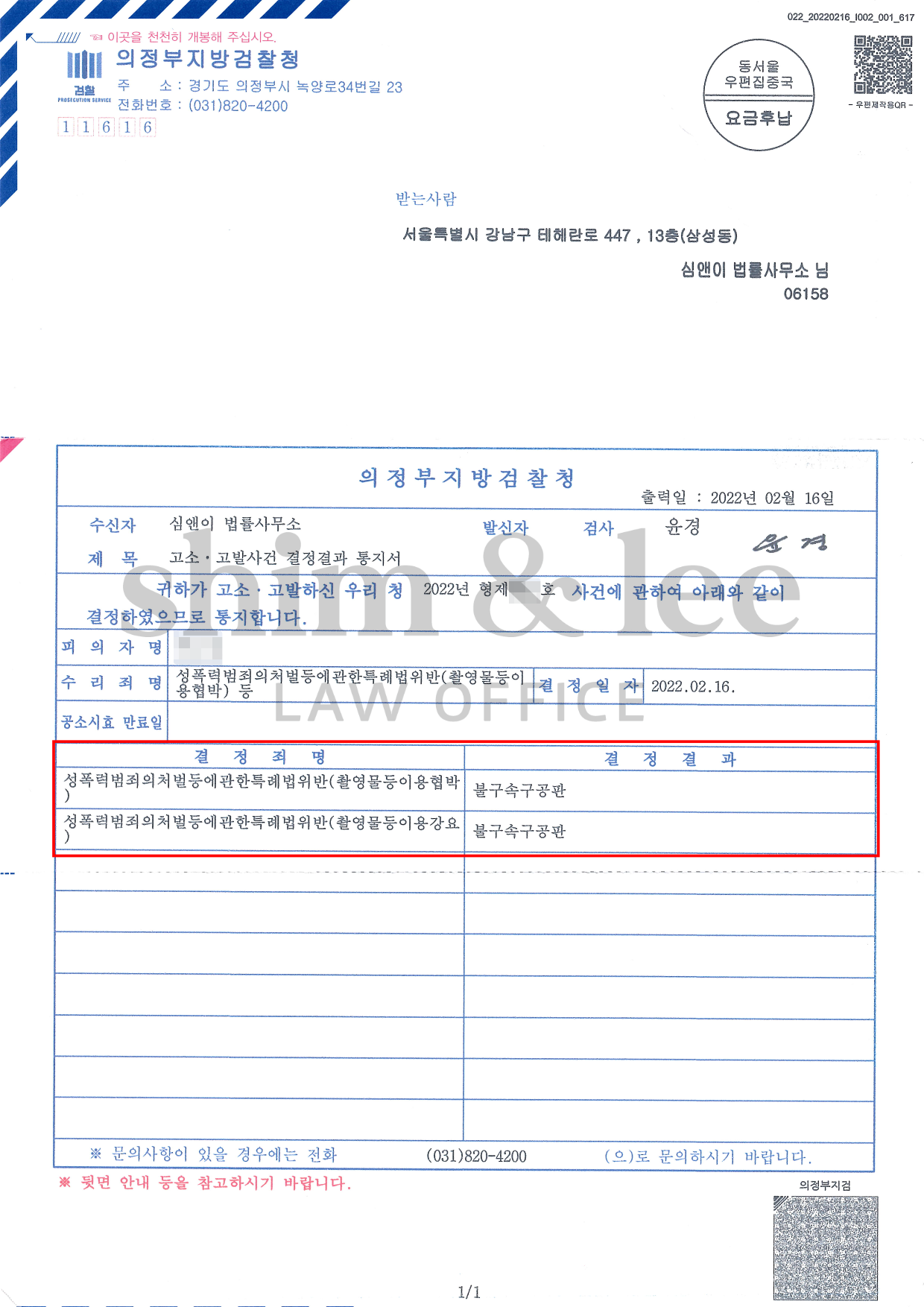 수사 결과 가해자가 자신의 핸드폰에 따로 보관해둔 것 말고는 추가적으로 저장한 곳이 없었고, 외부로 유출한 기록도 전혀 발견되지 않았기 때문에 의뢰인은 크게 안심하셨으며, 철저한 수사가 이뤄지도록 섬세하게 사건을 진행한 심앤이에 깊은 감사를 표하셨습니다.