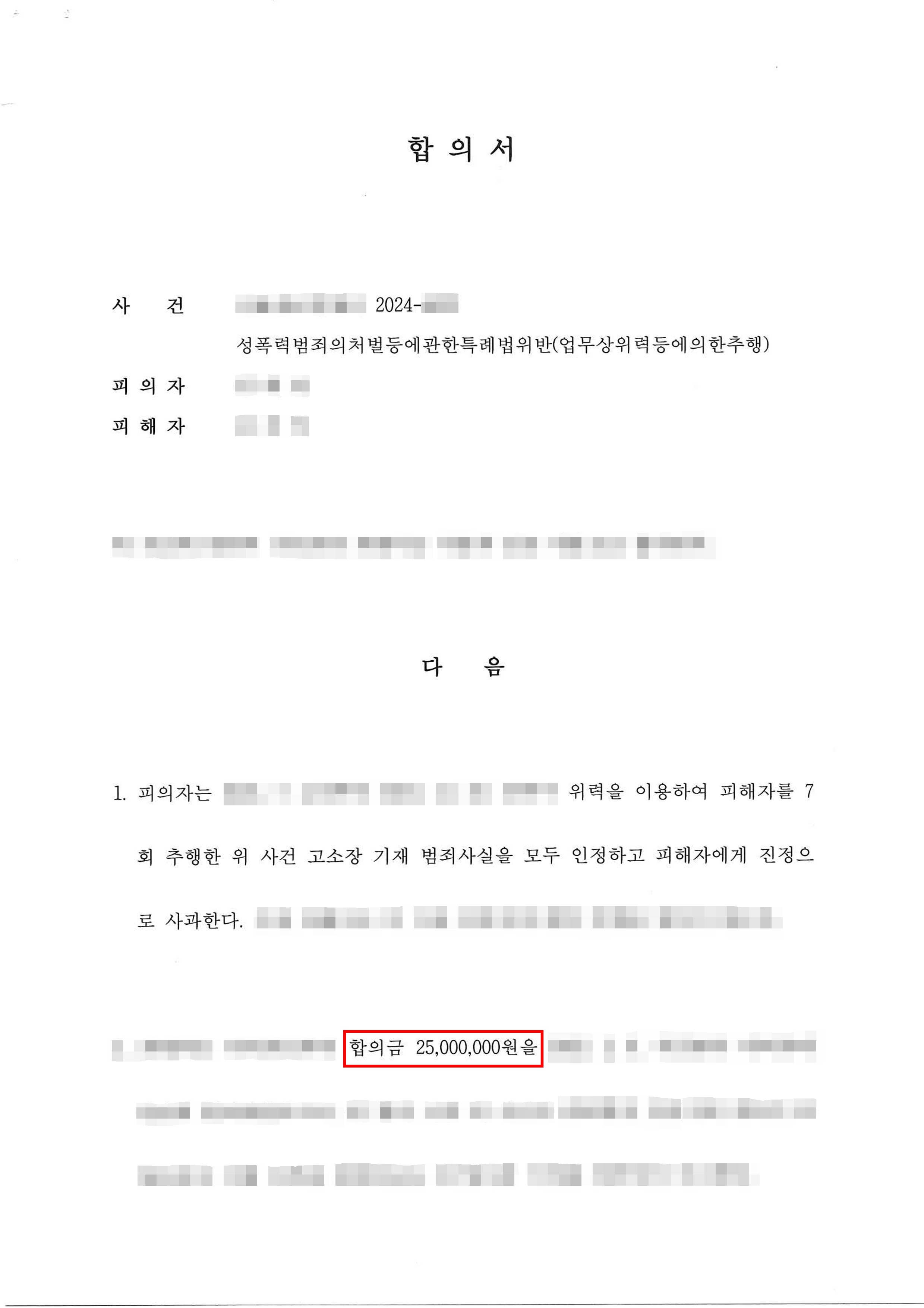 합의대행회식 후 직장상사에게 강제추행 당한 사건 2025.08.29합의금 3,500만 원 -