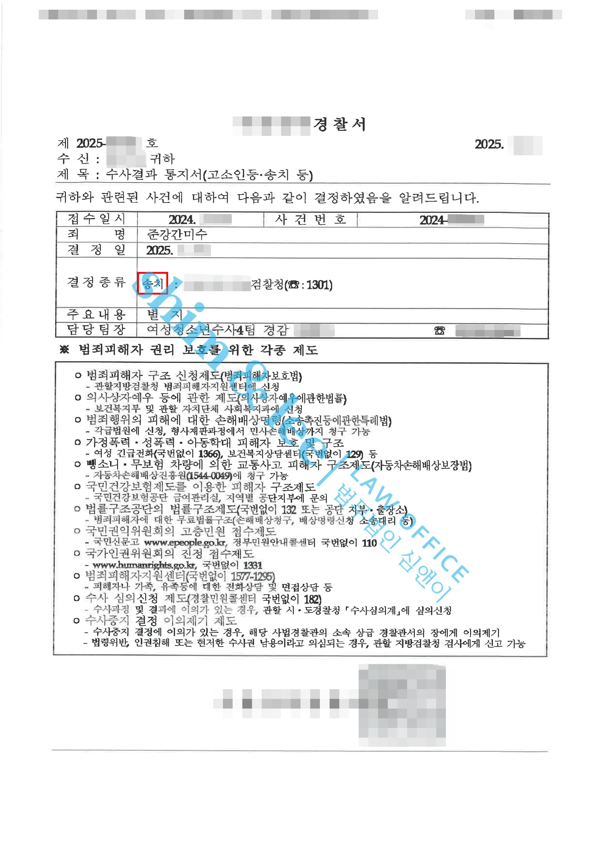 ①경찰서에 곧바로 선임계를 제출하여 변호사님이 피해자의 대리인으로 선임된 사실을 알리고 수사관과의 소통이 원활히 이루어질 수 있도록 조력했습니다. ②당시 의뢰인은 확보한 형사 자료가 하나도 없었기 때문에 정보공개청구 절차를 통해 피해자 진술조서, 해바라기센터에서 작성한 진술서 등의 자료를 확보했습니다. ③또한, 의뢰인은 경찰서에 제출한 증거 자료가 전혀 없었기 때문에 의뢰인께는 정신과 진료 확인서, 스트레스로 인한 대상포진 진단서 등 의료기록을 증거로 제출할 수 있도록 자료로 요청하고 정리하여 수사에 반영될 수 있도록 준비하였습니다.