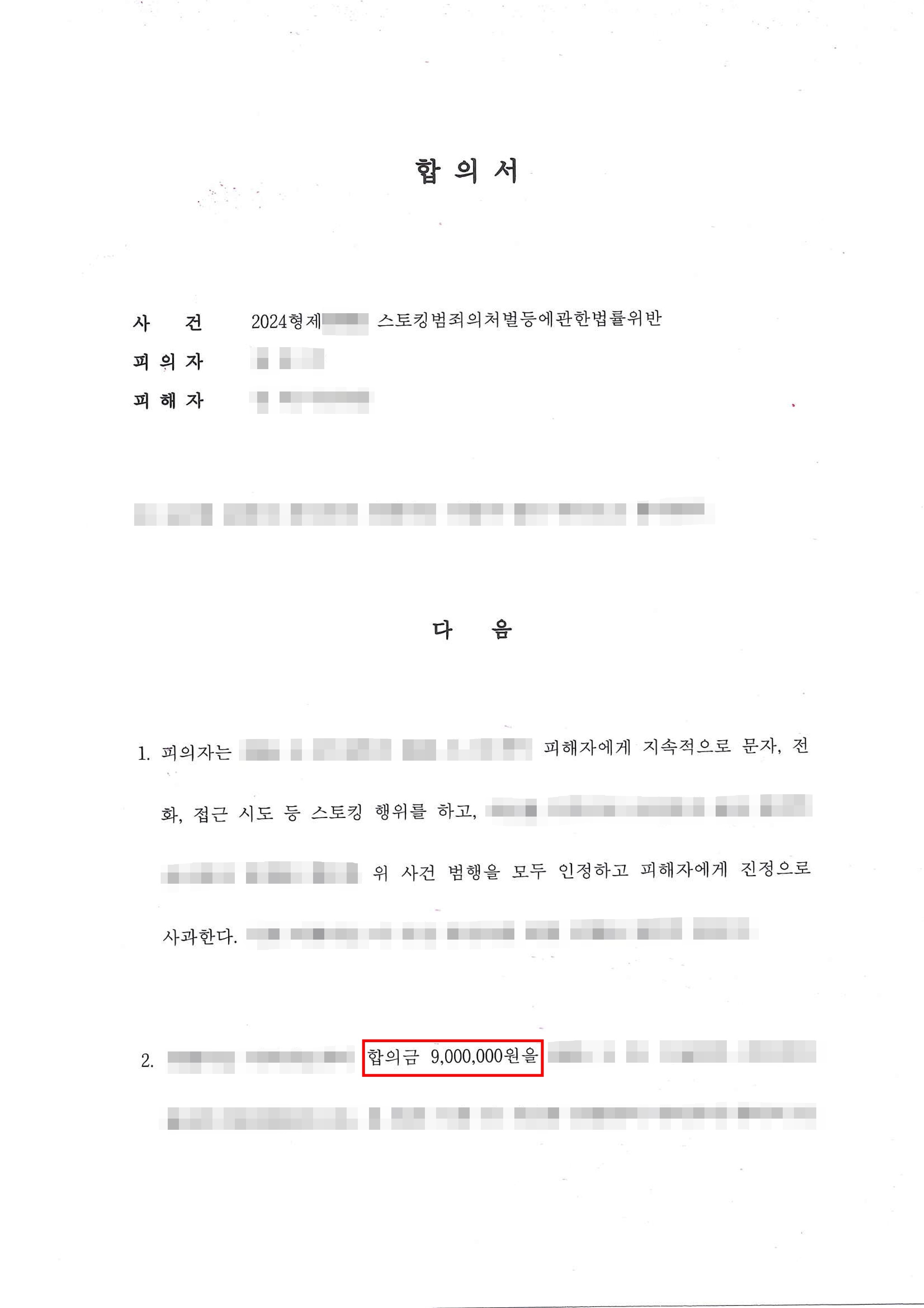 합의대행헤어진 전남자친구가 집과 직장으로 계속 찾아온 사례 2022.06.30합의금 720만 원 -