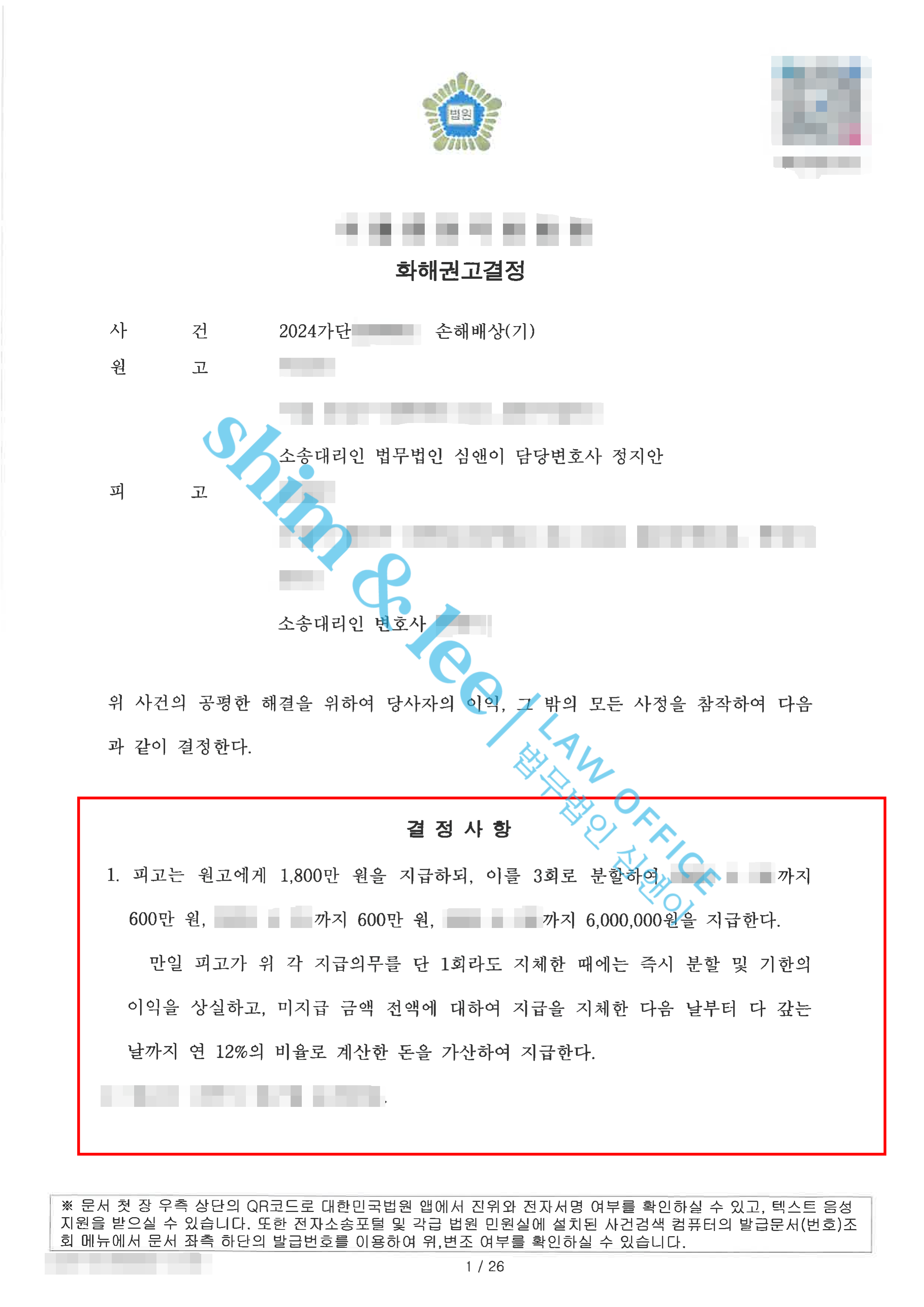 법원은 화해권고결정을 내렸고, 원고와 피고 모두 이에 동의하면서 결정은 그대로 확정되었습니다. 심앤이가 제출한 증거와 주장에 따라 의뢰인이 입은 정신적·물질적 피해가 인정되었고, 총 1,800만 원의 손해배상금이 인용되었습니다.