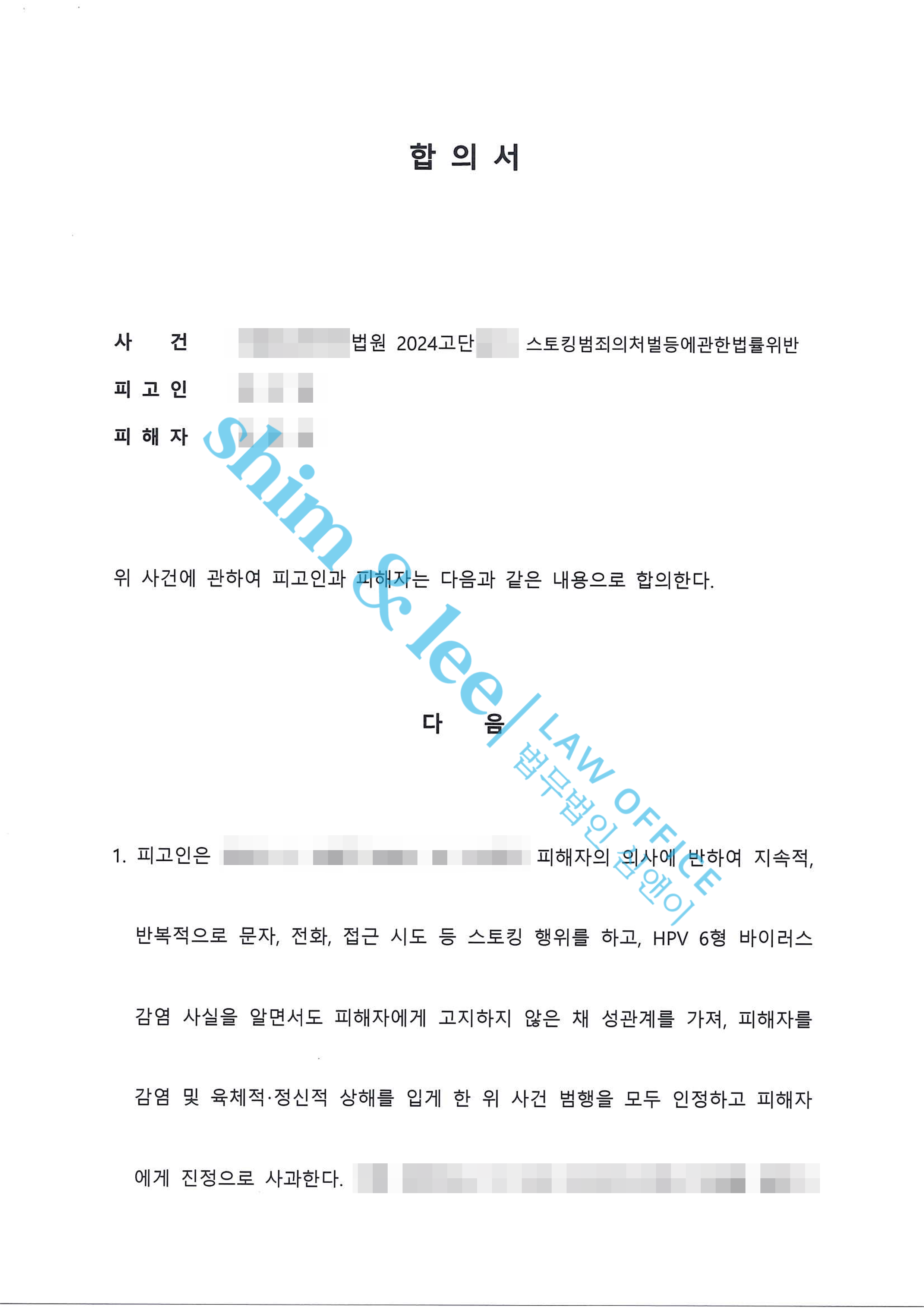 합의대행헤어진 전남자친구가 집과 직장으로 계속 찾아온 사례 2022.06.30합의금 720만 원 -