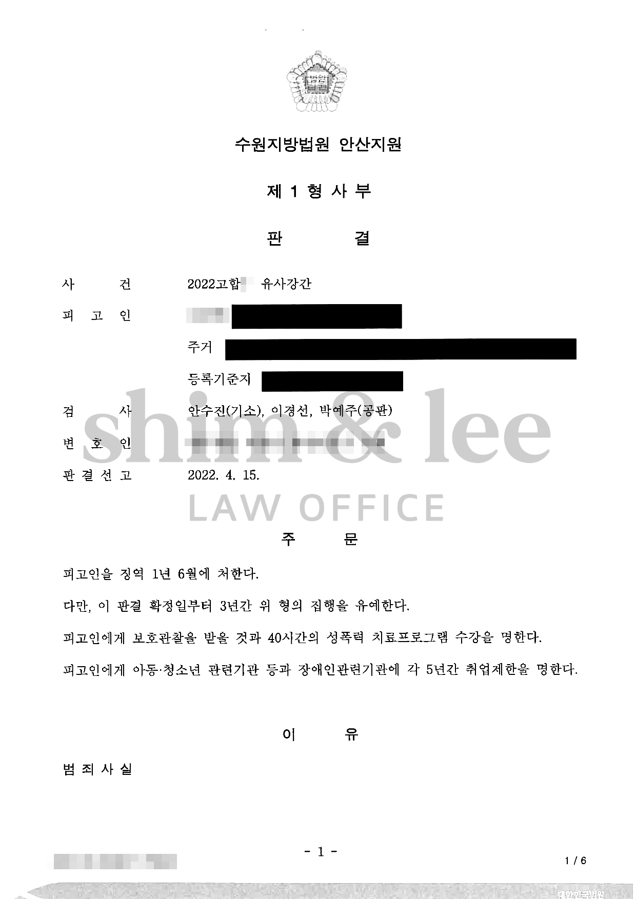 성폭력 치료강의 40시간 / 합의금 1,500만 원 -