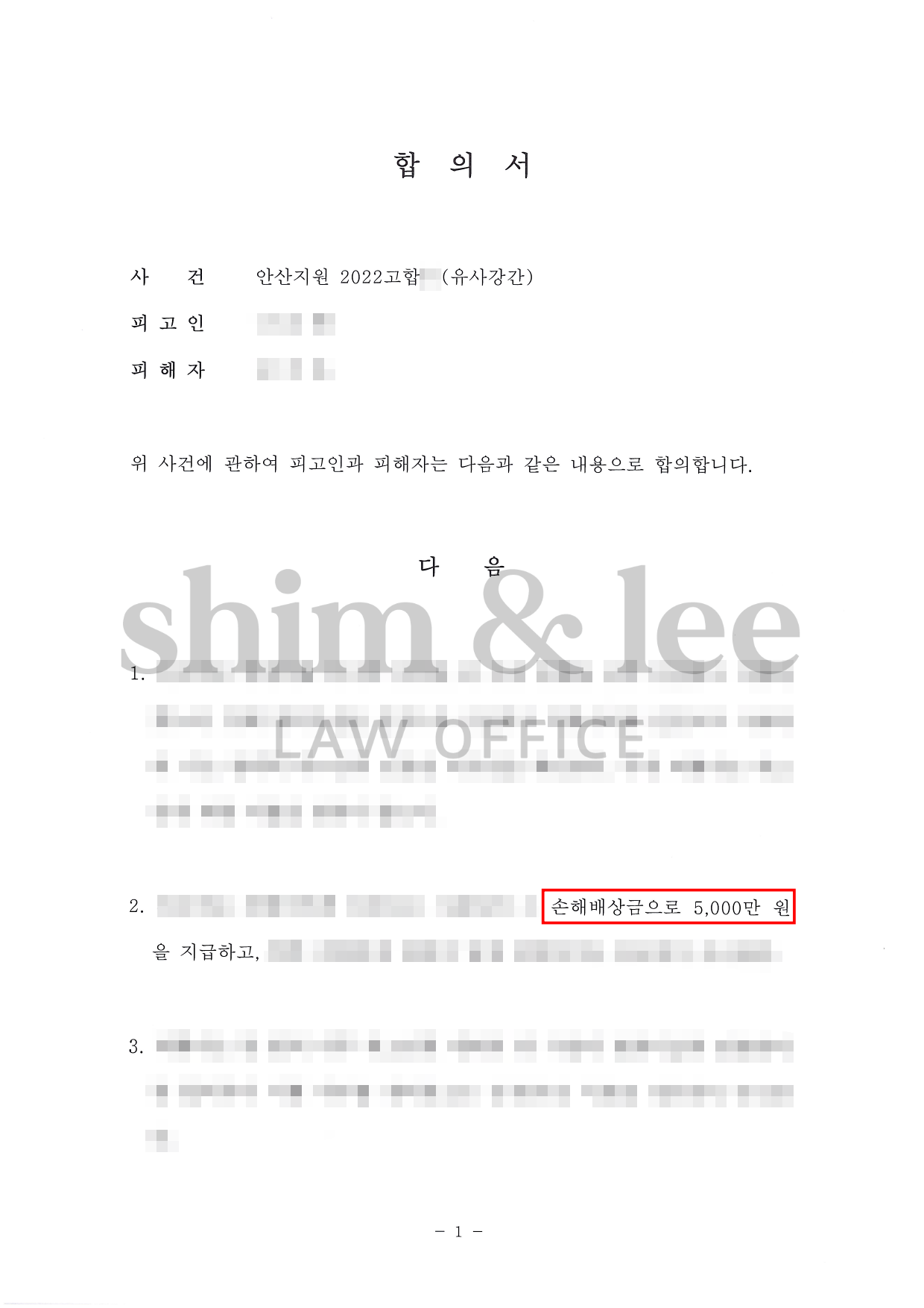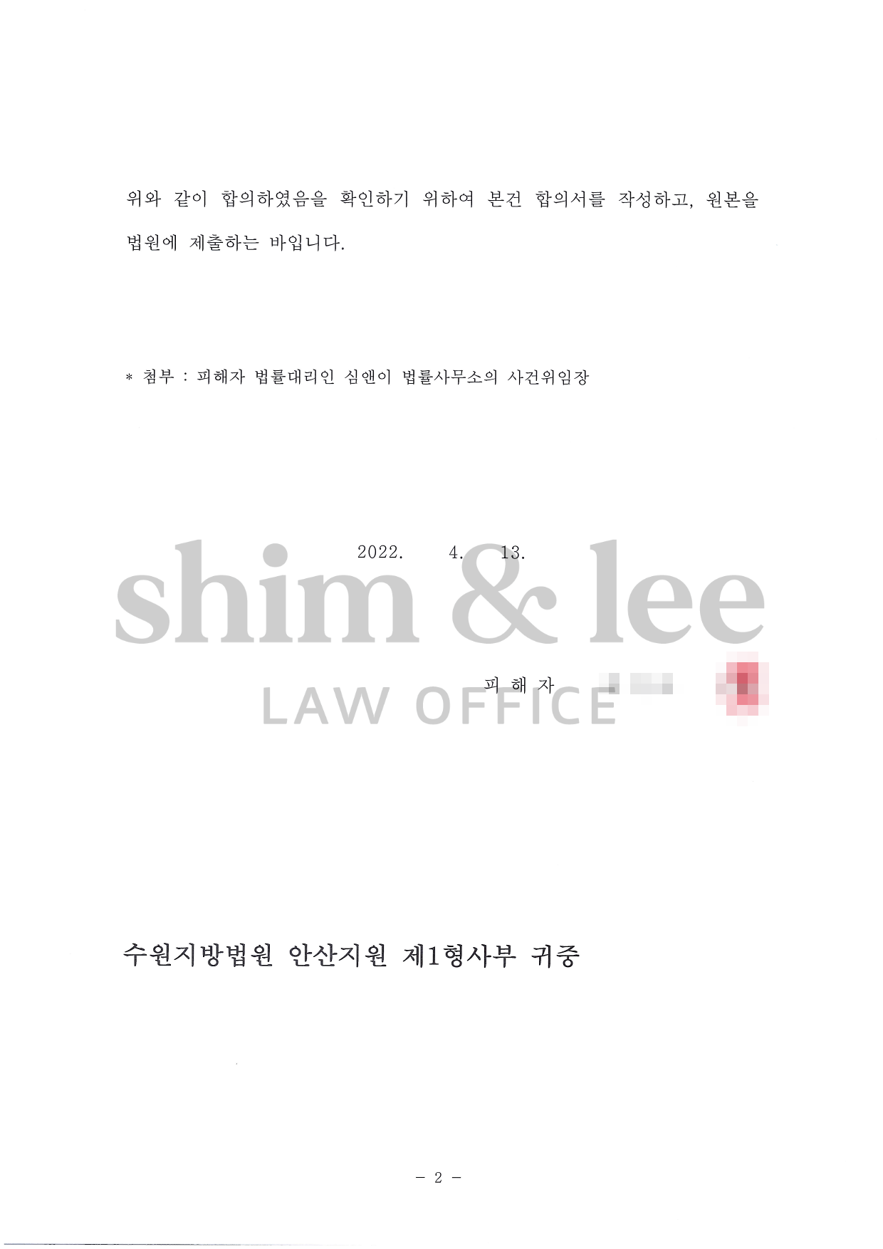 가해자는 결국 우리측의 제안액을 그대로 받아들여야 했으며, 급하게 합의서를 제출해서 간신히 집행유예를 받았습니다.