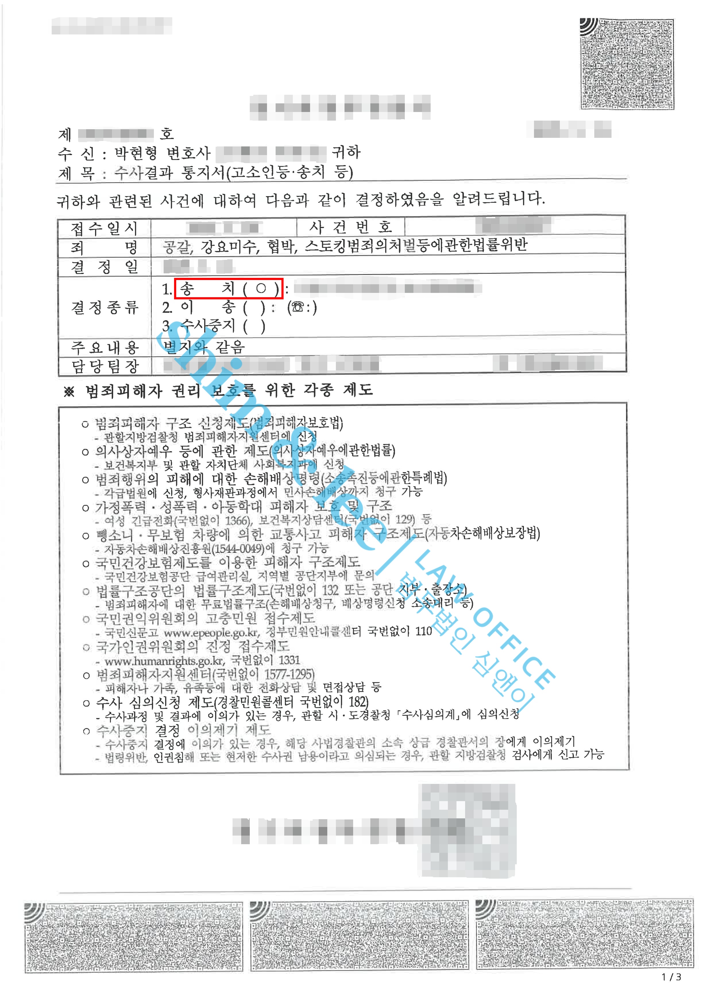 - 결국 변호사님이 특정한 공갈, 강요미수, 협박, 스토킹 네 가지 행위가 모두 인정되어 본 사건은 검찰로 송치되었습니다. 현재 심앤이는 검찰 단계에서도 사건이 정식 기소로 이어질 수 있도록 최선을 다해 대응하고 있습니다.